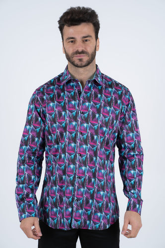 Purple Rings Print Satin Cotton/Spandex Long Sleeve Shirt