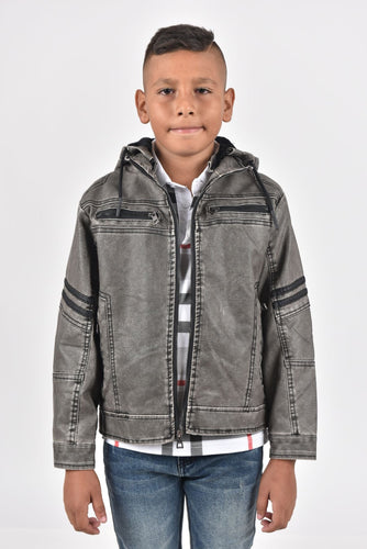 Kid's Gray Hooded Washed Biker Jacket with Fur Lining