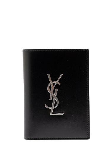 Saint Laurent Men Black Leather Wallet With Ysl Metal Logo Man