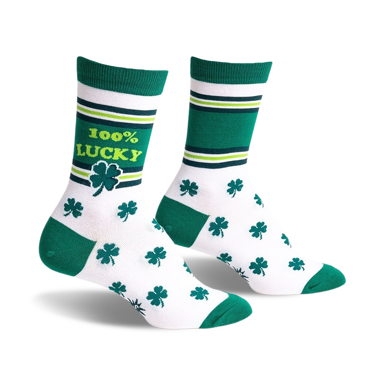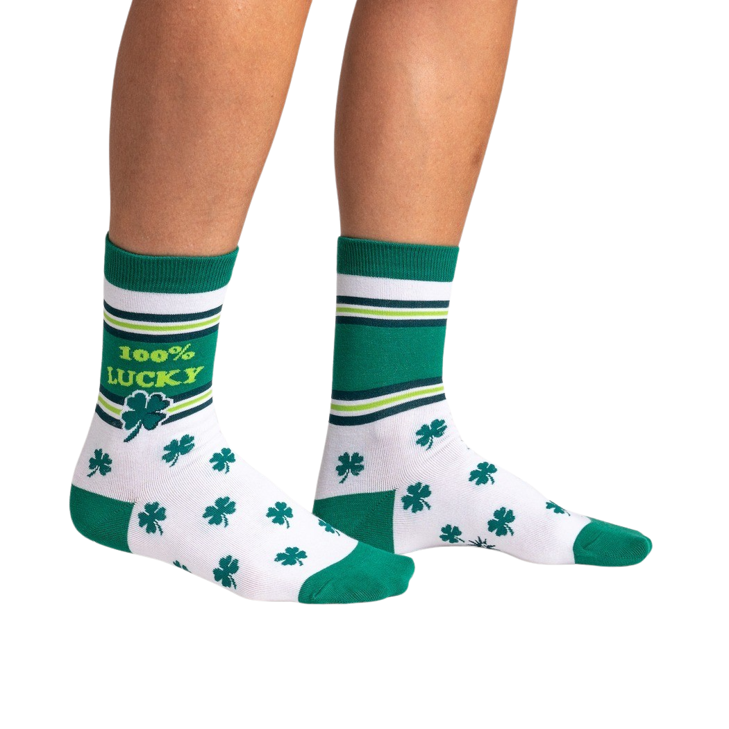 Lucky Charms on Your Feet: Jump into a pot of gold and step out 100% lucky in these clover-covered women's crew socks! With their vibrant green clovers against a crisply white backdrop, these socks are basically good fortune you can wear. And did you know the word "clover" comes from the Old English word "claefre" meaning "divided into three?" Yeah, these socks are shamrockin' you with knowledge and style!