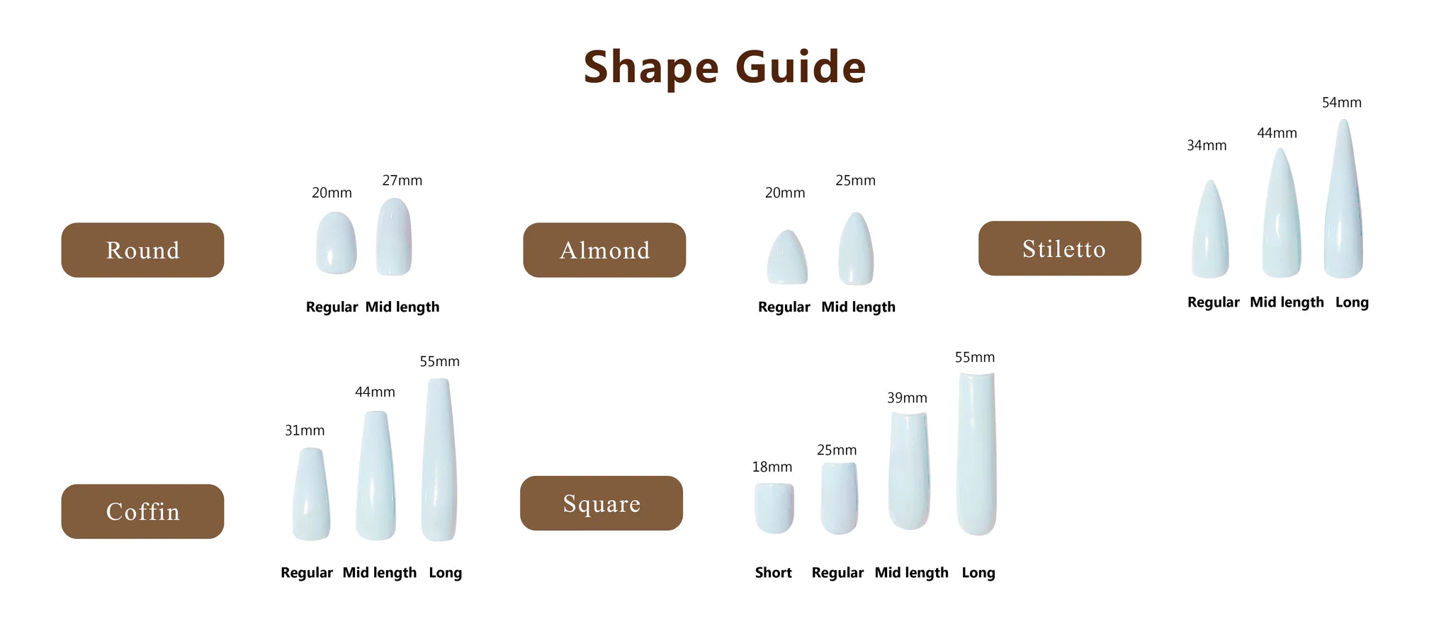 Simply measure your nails with tape, and use our picture guide to find your perfect fit.