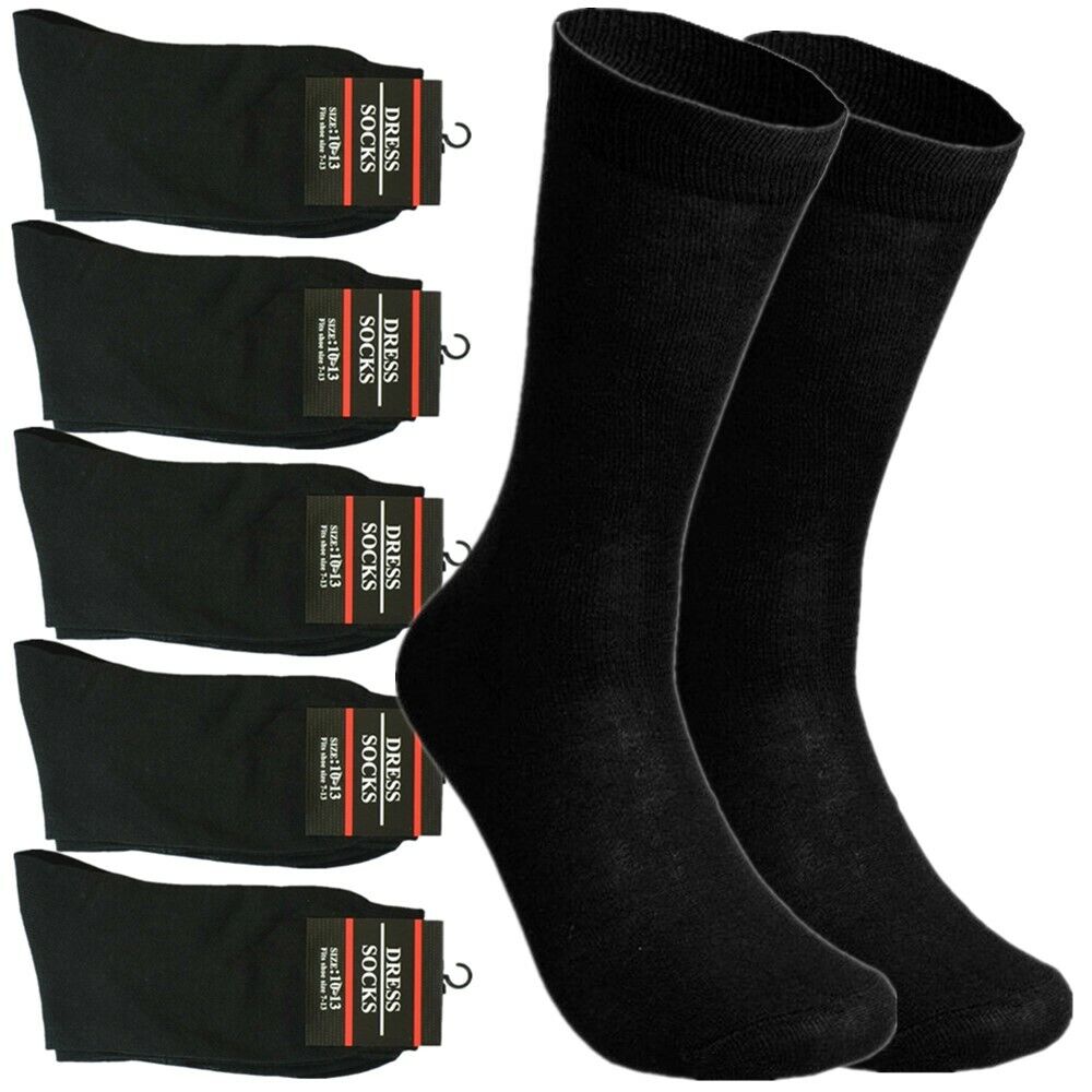 This pack consists of 3-12 pairs of men's solid black cotton socks, suitable for both casual and formal occasions. The socks are available in size 10-13, which fits USA shoe sizes 6-12. They are made with a blend of 80% cotton and 20% polyester and colors may vary.