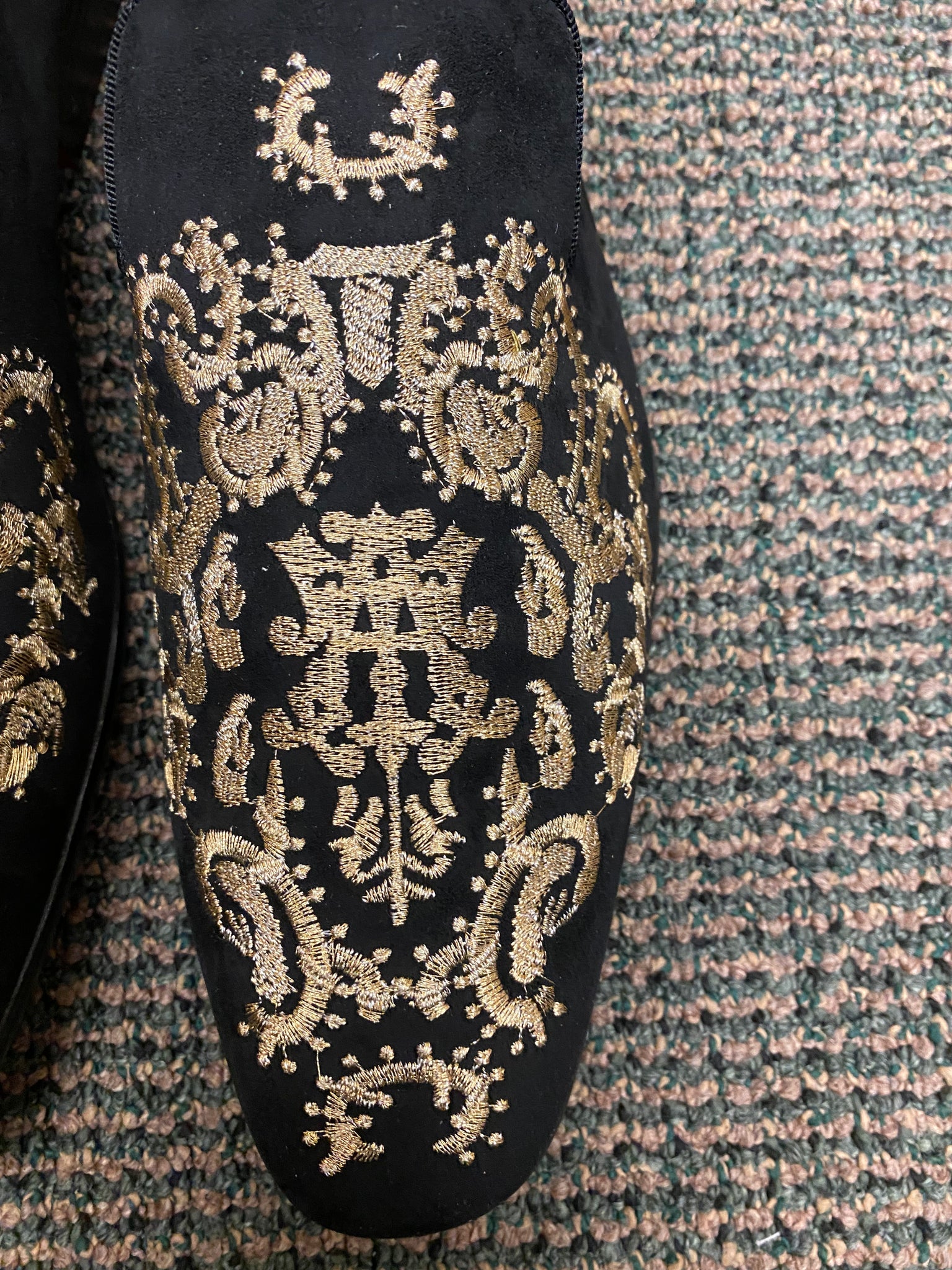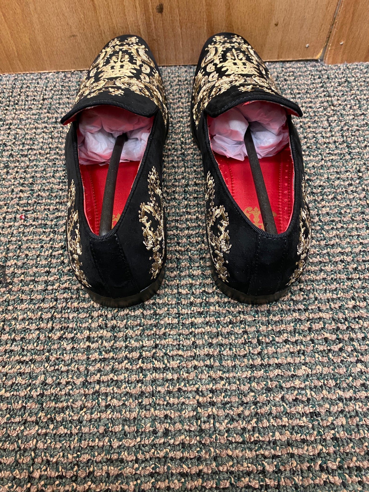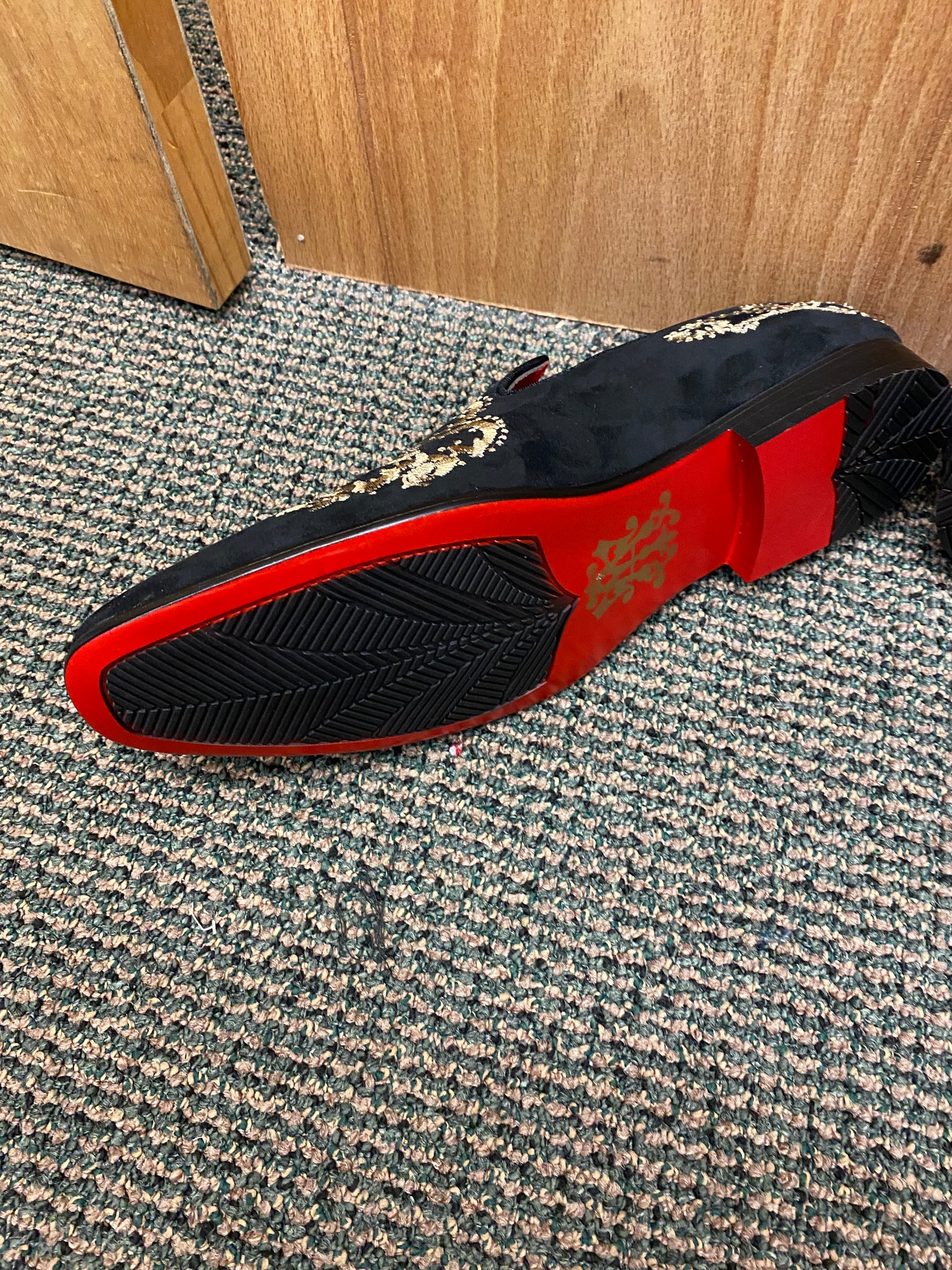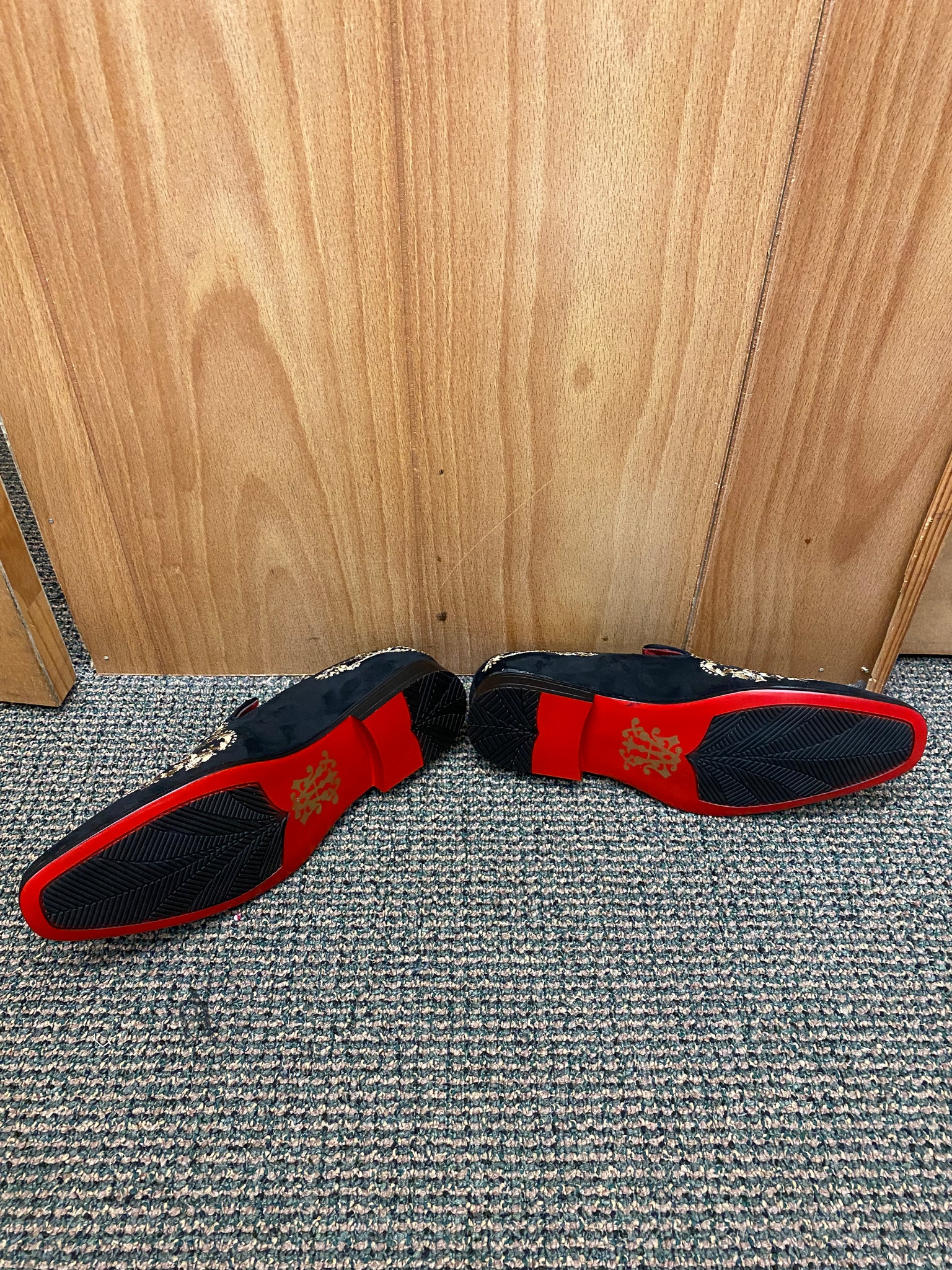 Step out like Royalty with these new shoes Black/gold shoes by After Midnight. Black brush suede with fancy gold embroidery slip-on dress shoe with red bottom. Great for proms, formals, galas, etc.