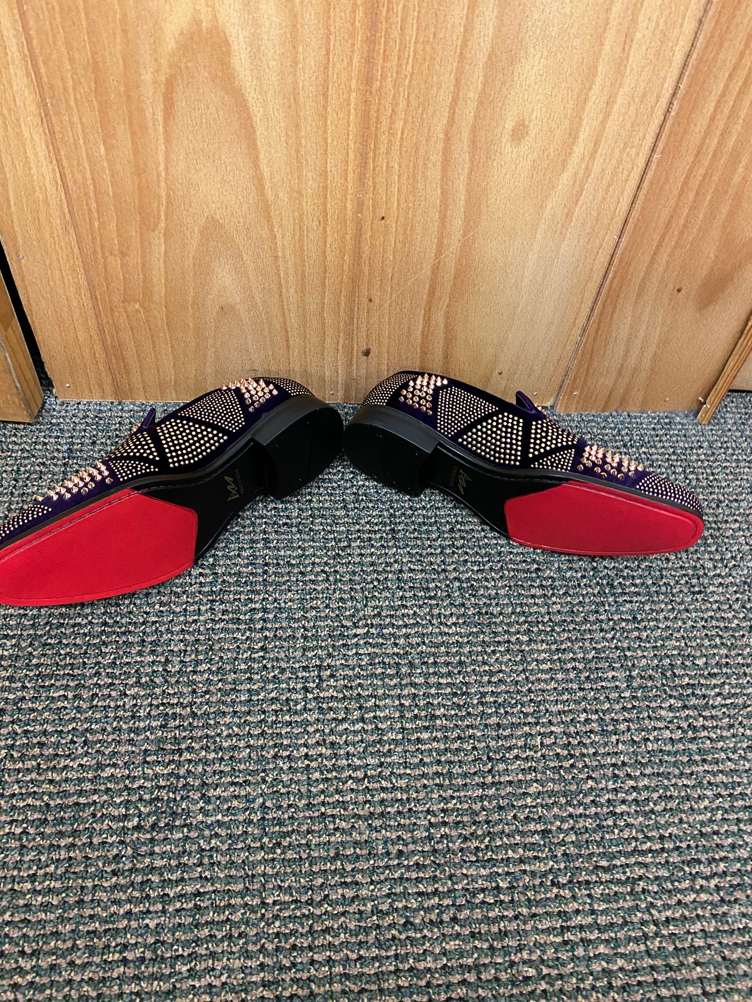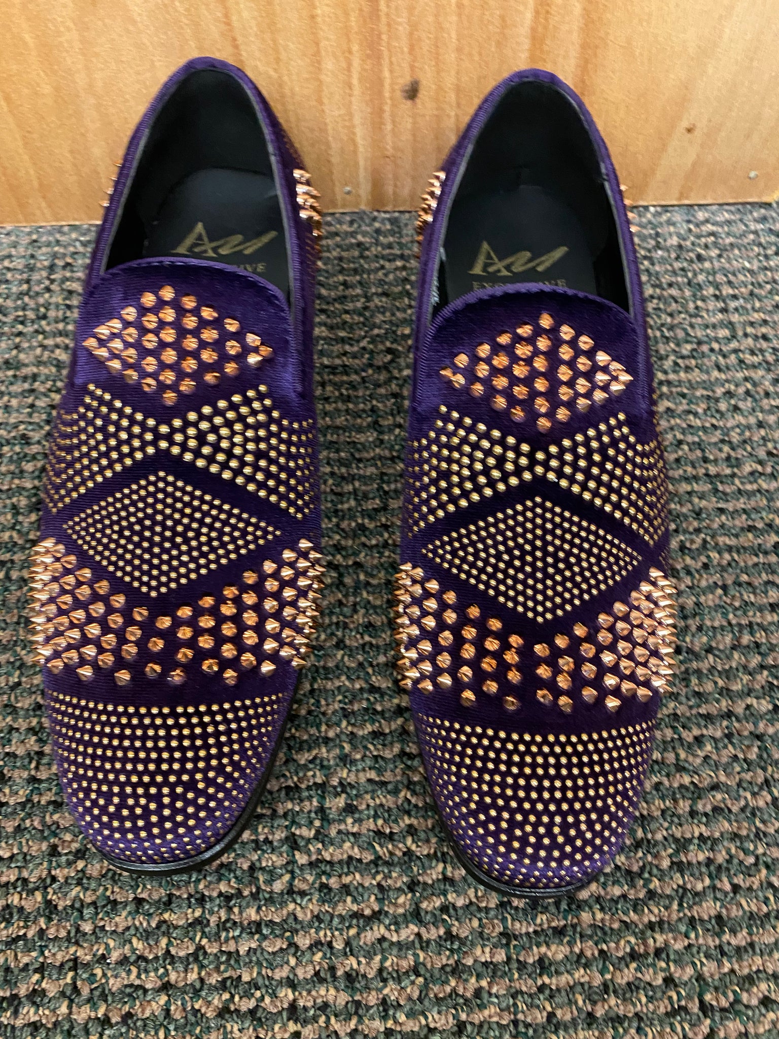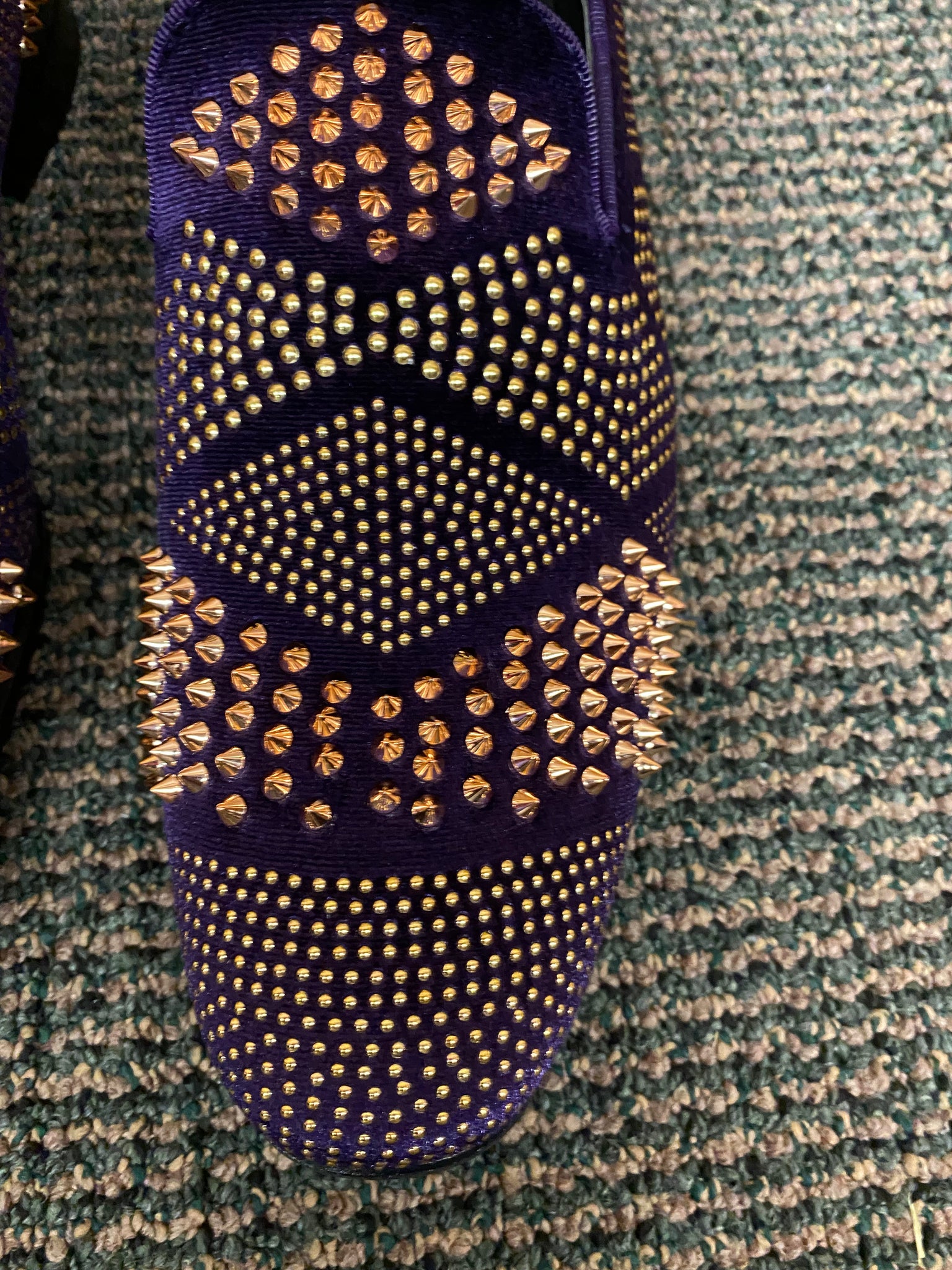 • Purple suede like shoe with rose gold spikes and gold studs of varying sizes