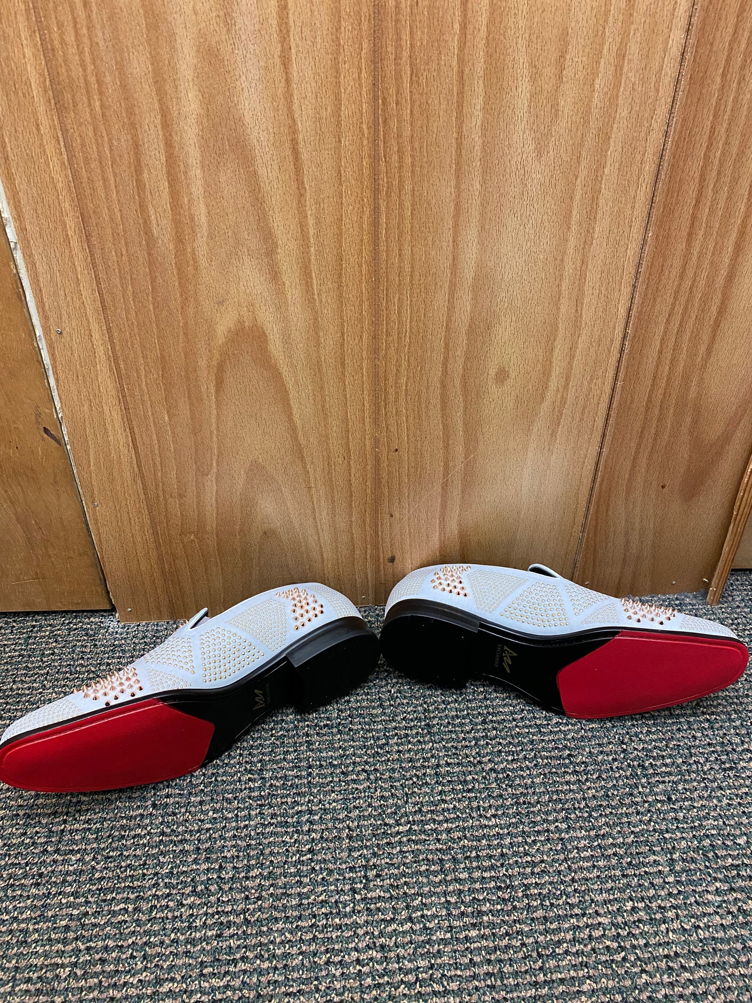 After Midnite Exclusive Ozzy White/Gold Spike Men’s Smoking Slip-on Red Bottom Men’s Dress/Prom Shoes