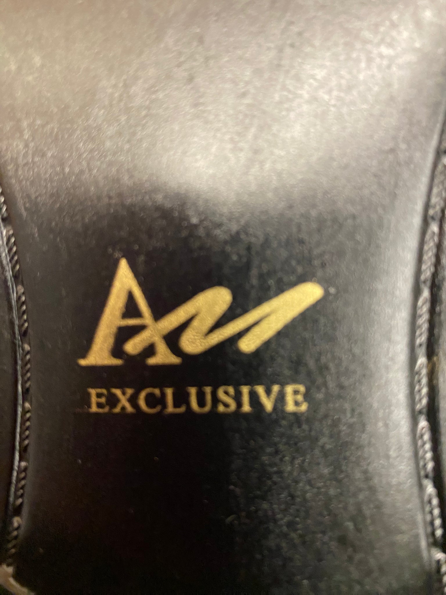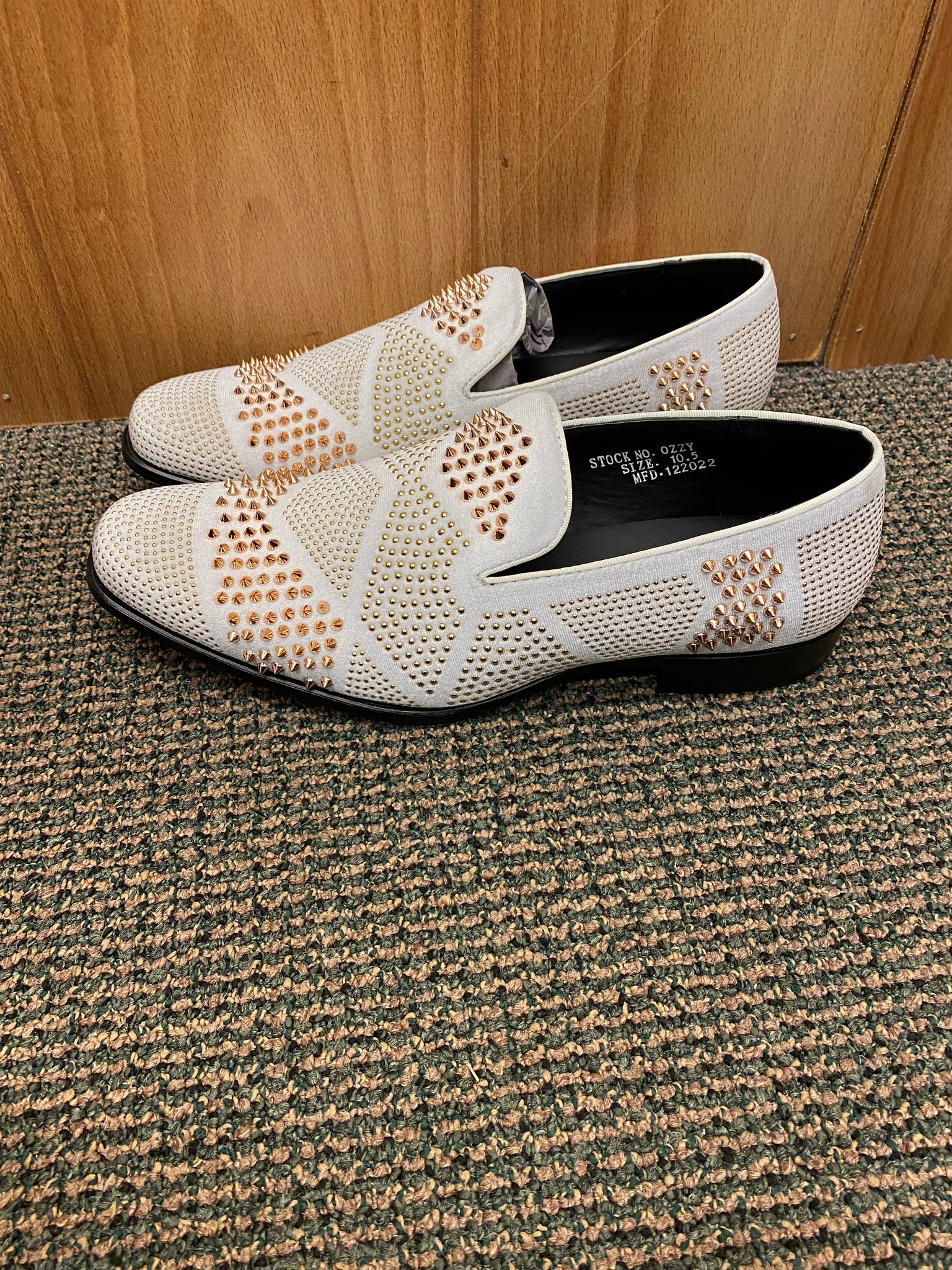 • White suede like shoe with rose gold spikes and gold studs of varying sizes