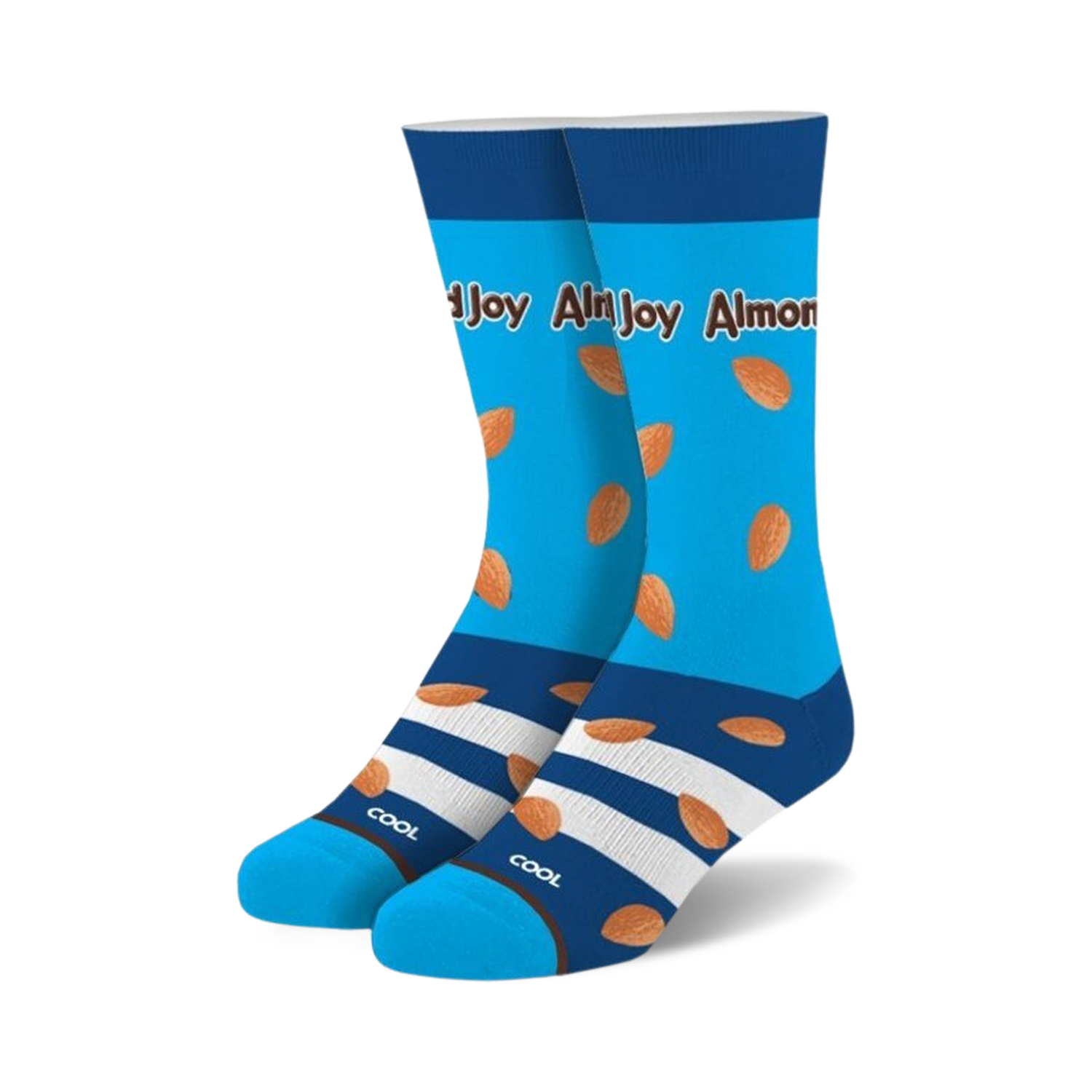 Almond Joy fans, unite! These blue crew socks have a delicious pattern of brown almond-shaped objects and white stripes at the top. Whether you're hitting the trails, hitting on your crush, or just chillin' at home, these socks will make you feel like you're on a tropical vacation. Plus, they're unisex, so you and your boo can match!