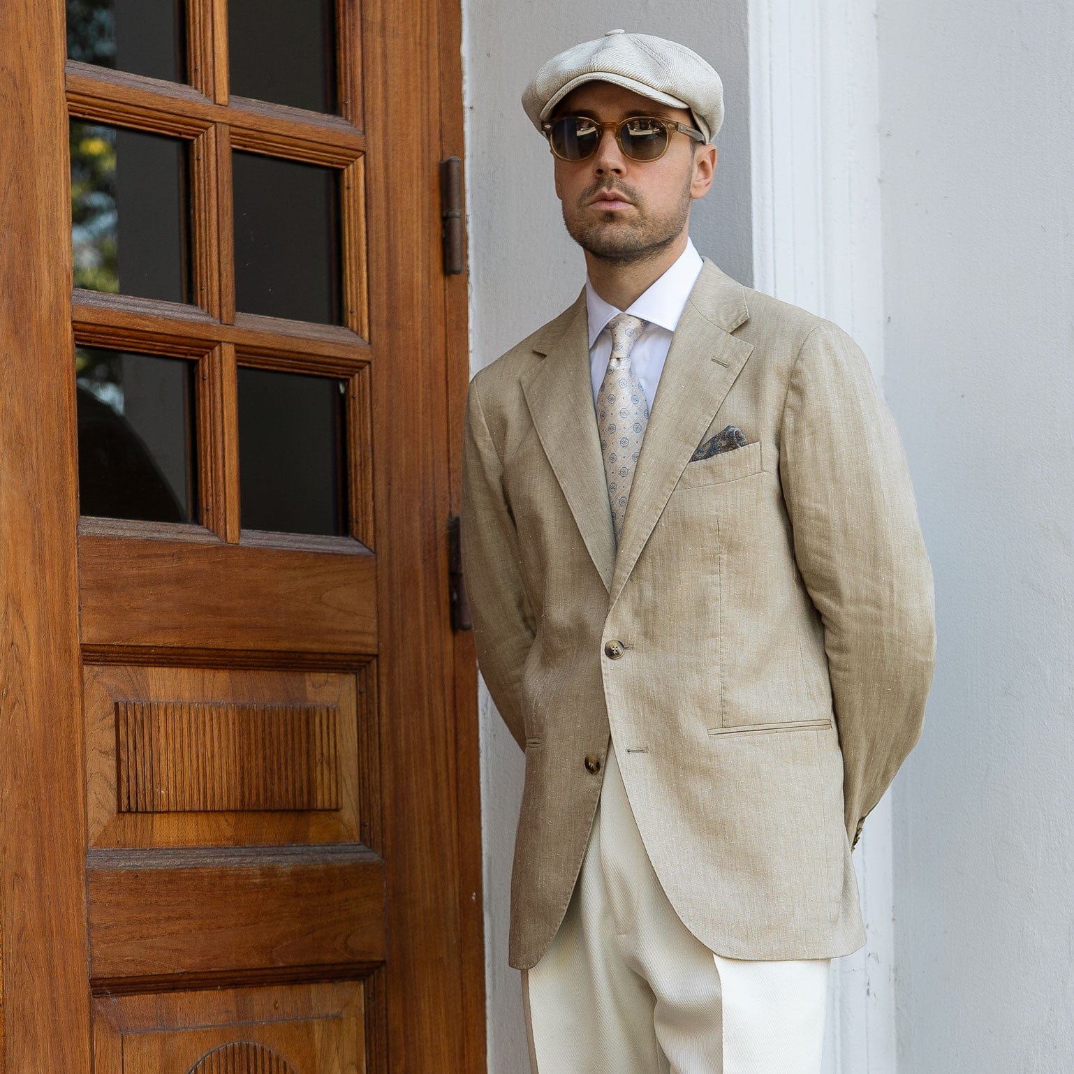I designed this tie with shades of beige and a touch of blue, perfect for the gentleman who appreciates quality and classic styling.