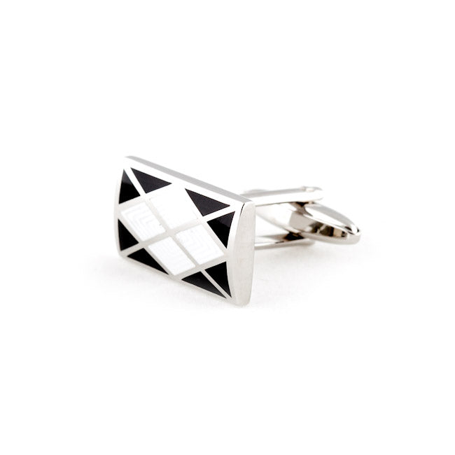 At once classic and playful, the intersecting lines of this mini argyle pattern contrast with just the right sense of balance. Stark silver toned edging and white diamond shaped center piece seem to pop out from a field of black enamel. Subtle lines echo inside the white, giving it a sense of depth. The perfect way to tie together the whites and blacks of formal wear, or to compliment a pair of cross-hatch socks.