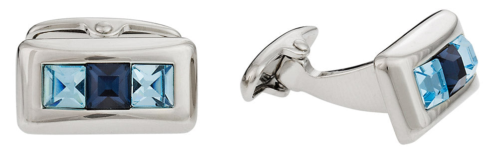 Enhance your look with a flash of blue with these Soho Swarovski crystal cufflinks. The links are centered in a silver rectangular frame and showcase three different crystals. Two light blue crystals surround a dark blue center. The set is brighter than it is dark and looks best when work with a dark outfit. The crystals are meticulously lined up and the whole set has a clean and high quality look. The silver frame and clip is highly polished and continues that look of quality that the crystals start. Wear this set with pride, or give these crystal cufflinks away to a friend or family member.