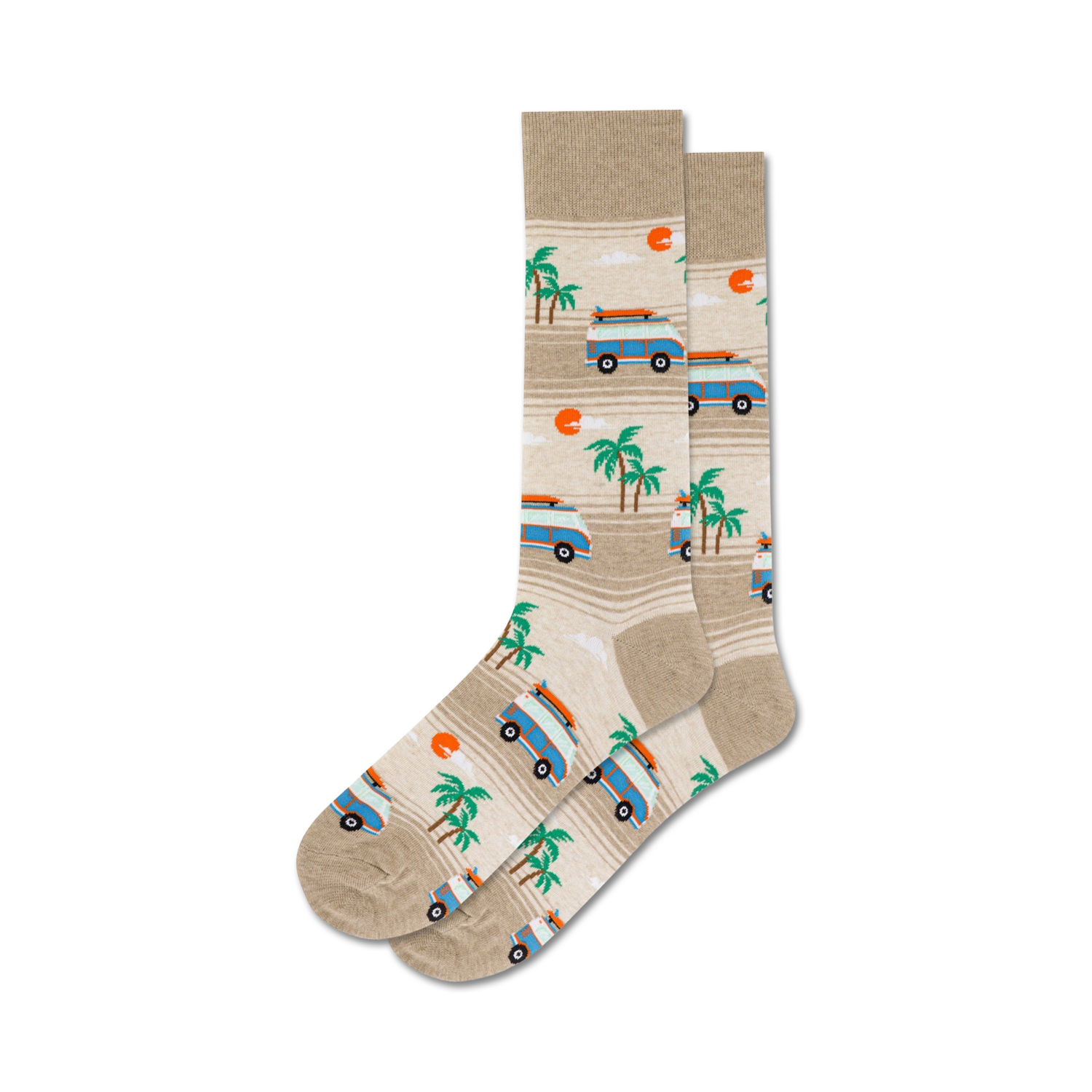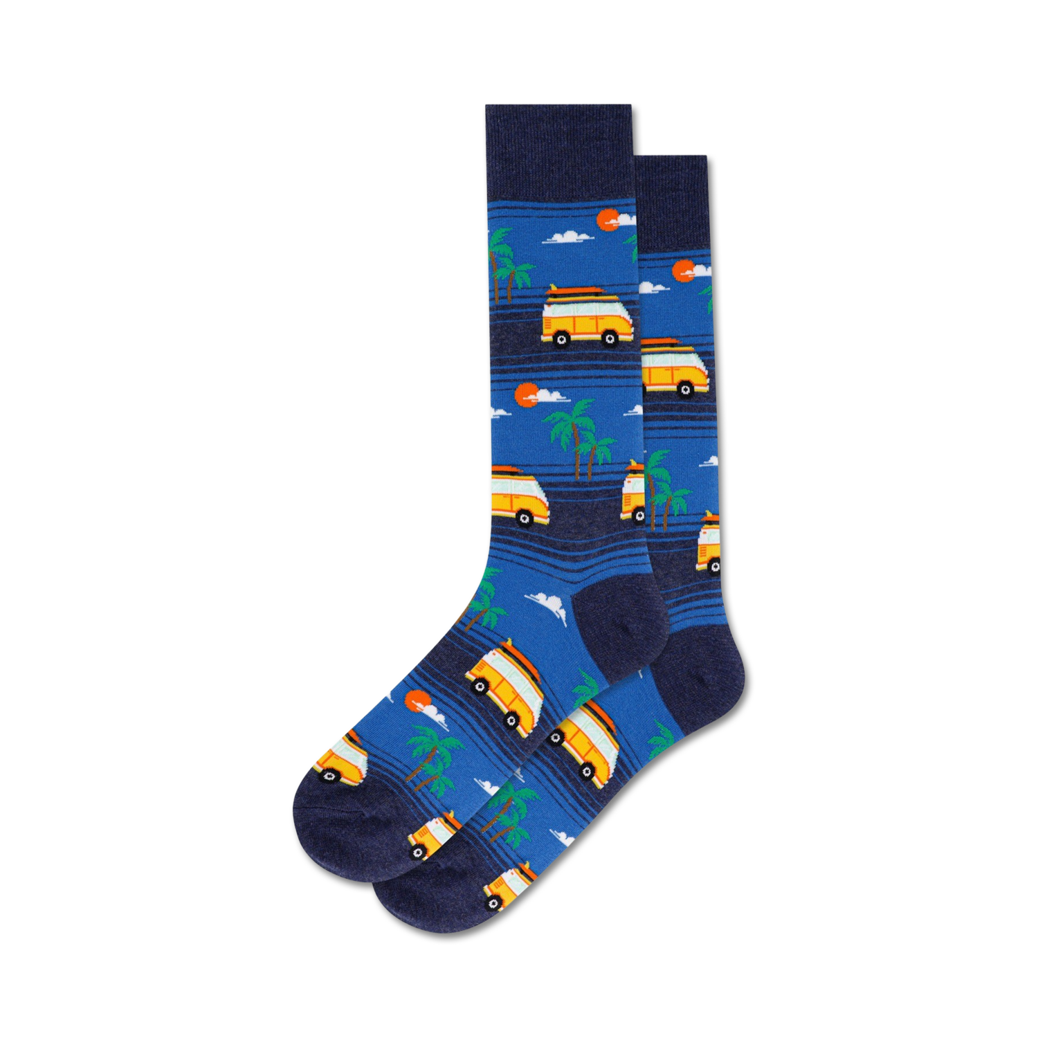 Take a road trip to the sunny shores with our Beach Van Crew Socks! These comfy socks feature yellow and orange vans cruising along a scenic beach dotted with palm trees, a perfect fit for any beach lover. These socks will bring a touch of summer fun to your everyday wardrobe.