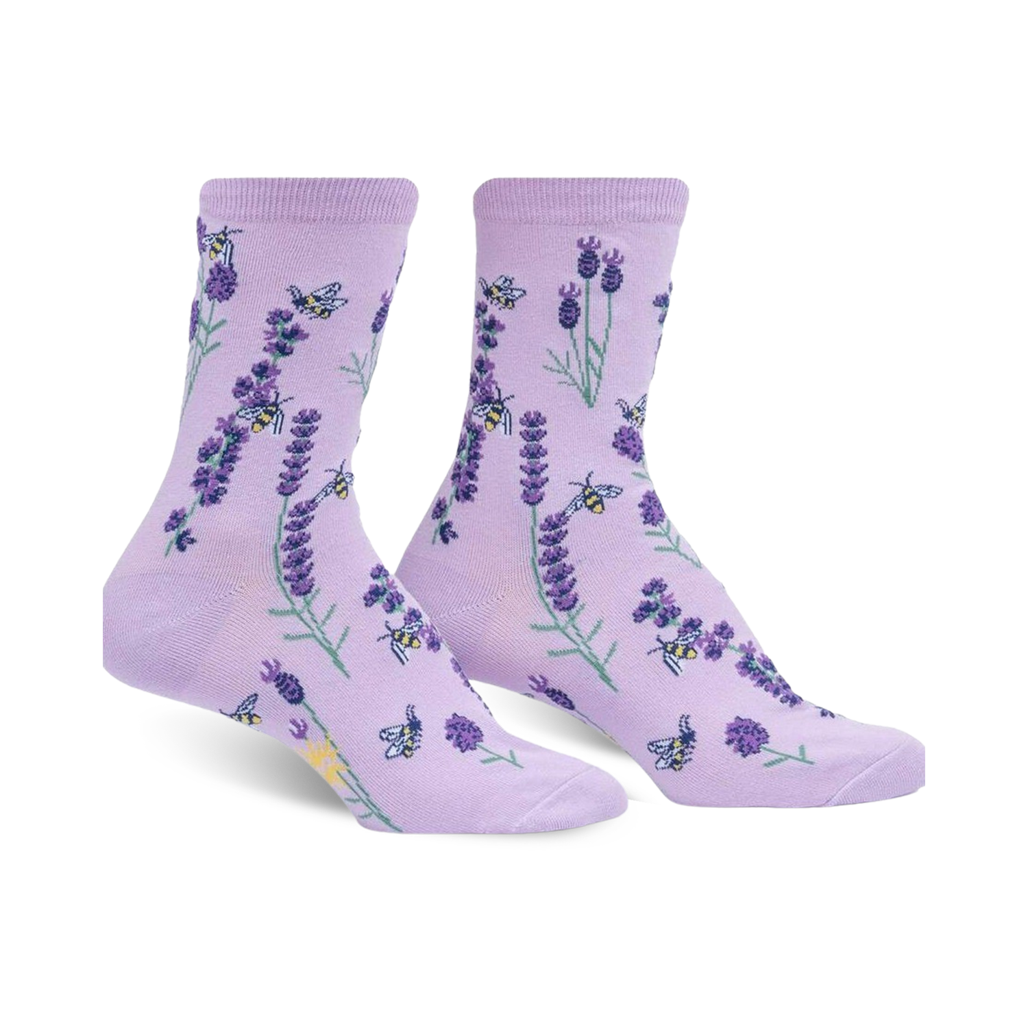 Check out our Bees and Lavender socks! These purple crew socks are covered in an adorable pattern of black and yellow bees buzzing around dark purple lavender flowers with light purple and yellow centers. They're 100% buzzworthy!