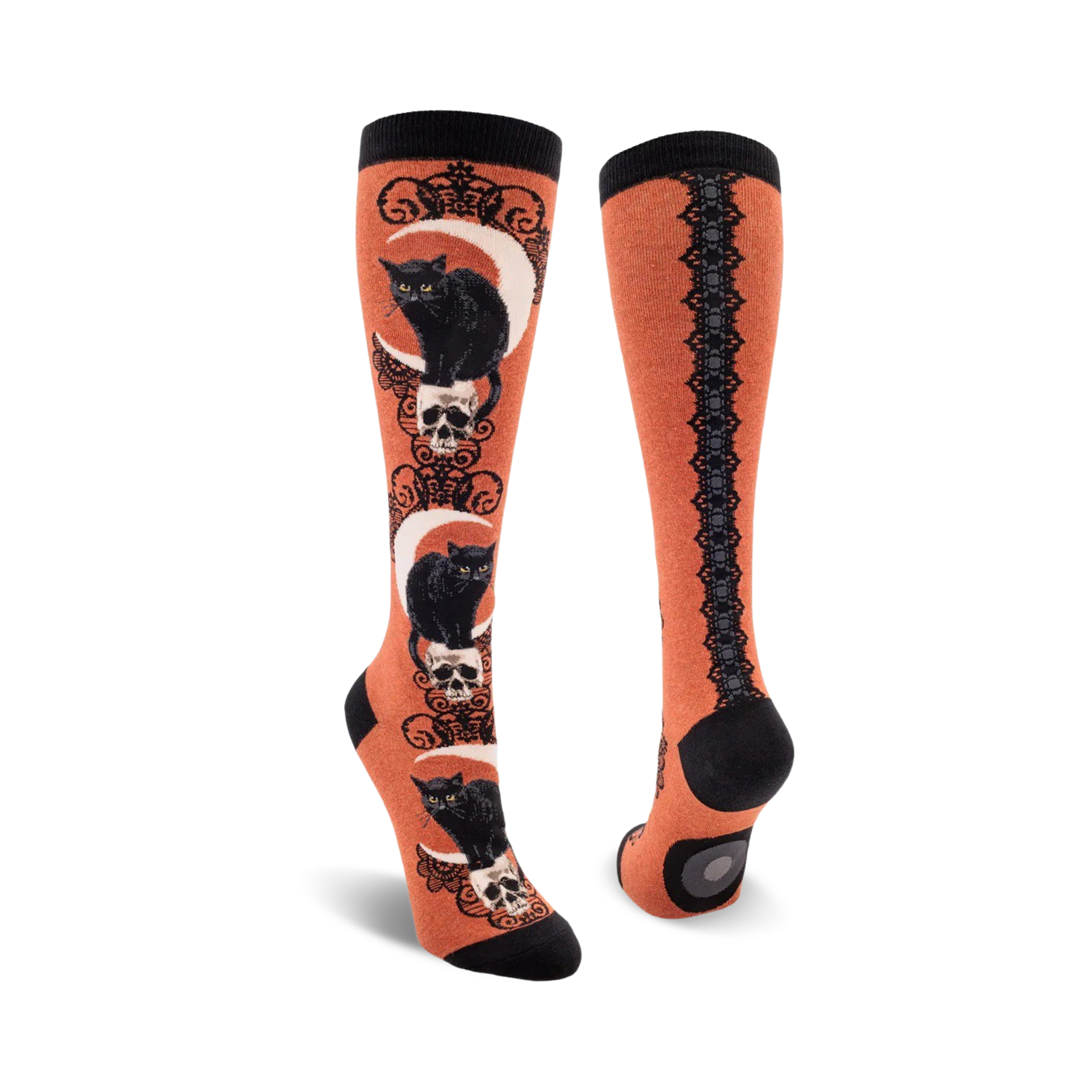 Black cat, moon, and skull lovers rejoice! These knee length socks are an adorable, yet spooky way to keep your feet comfy and cozy. The vibrant orange shade will lift your spirits and turn heads while the lace pattern adds a touch of sophisticated elegance. The cat, skull and moon pattern will have you feeling like a mystical witch, ready to cast spells!.