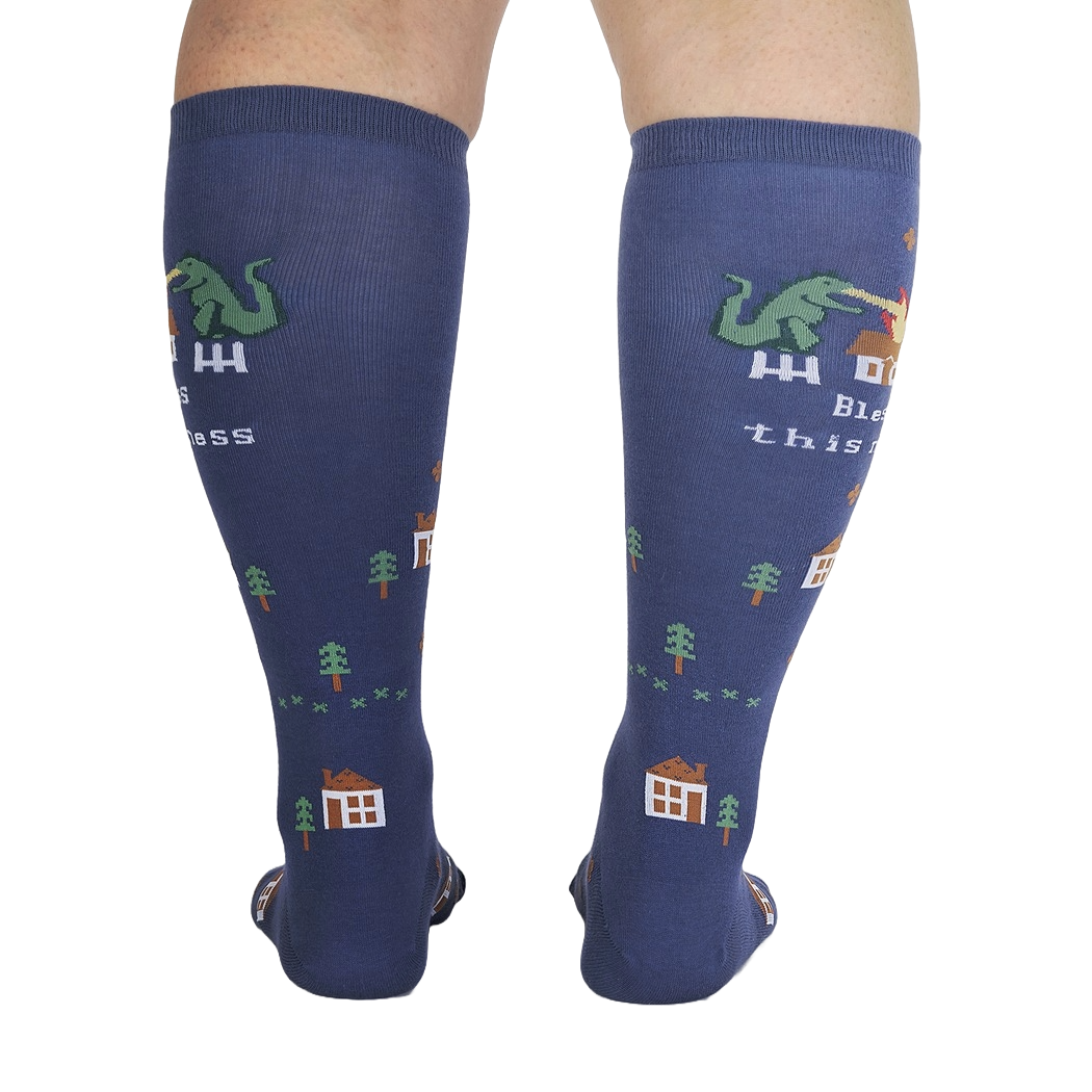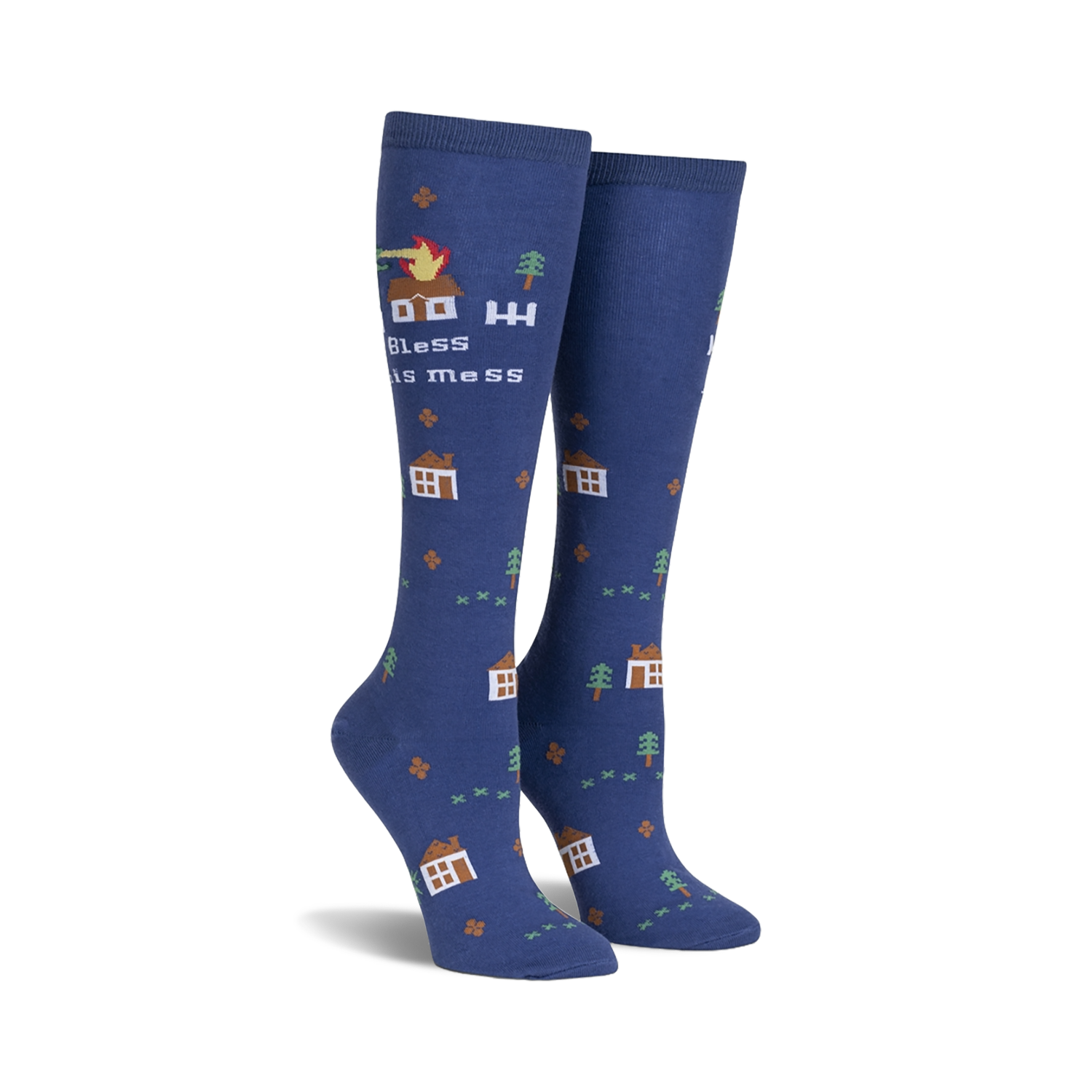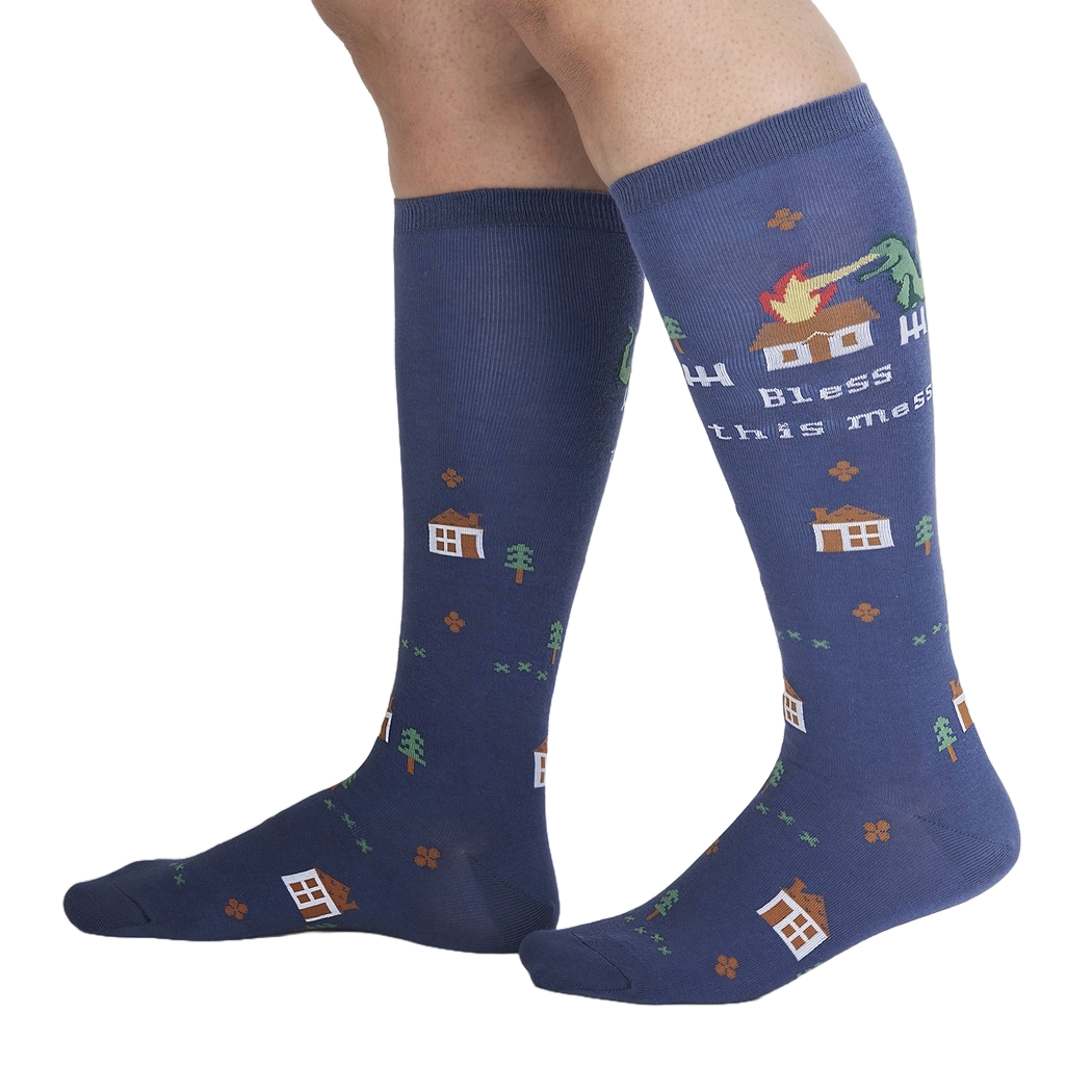 Knee high blue Bless This Mess socks splashed with pixelated houses, trees and flames are a fun, stylish way to add a touch of whimsy to your sock drawer. Inspired by the popular meme, these unique socks are sure to bring a smile to your face and those around you. Who knew chaos could look so cute?