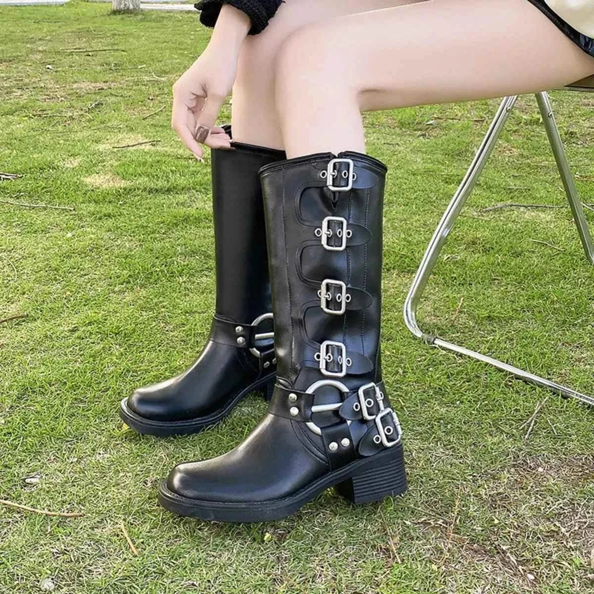 Elevate your biker chic look with our block heel knee-high motorcycle boots featuring a buckle detail. These boots are designed to make a statement while providing all-day comfort. The sturdy block heel ensures stability while the knee-high length adds a touch of edgy sophistication to any outfit.
