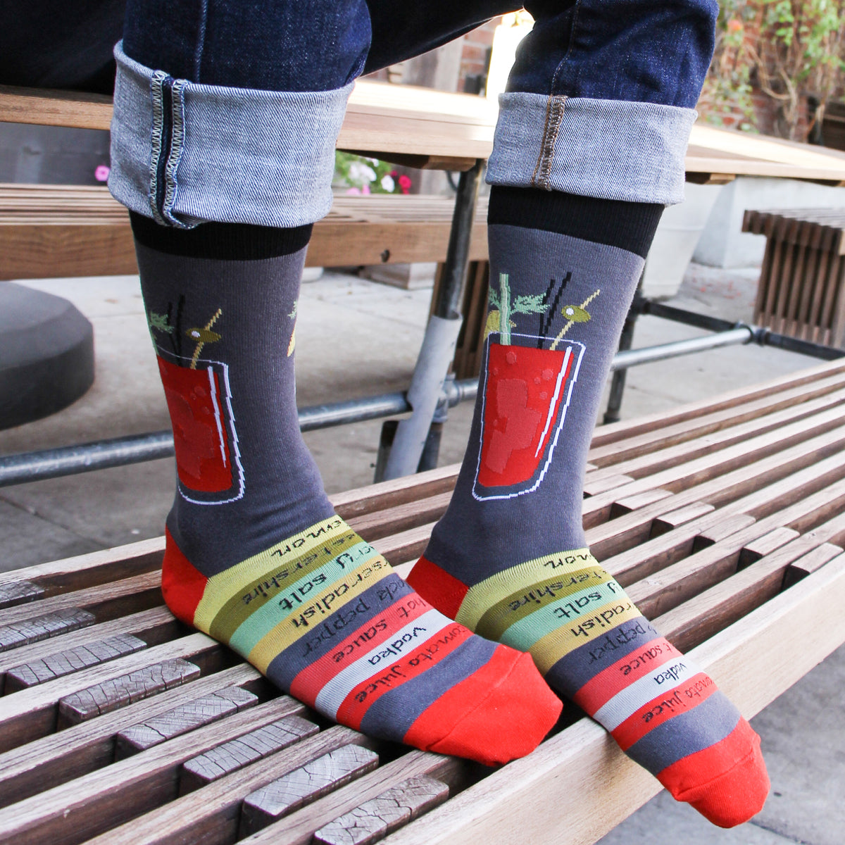Bloody Mary socks: the perfect way to add a little fun to your sock drawer. These gray socks with multi-colored stripes at the top and a Bloody Mary drink with a celery stalk and olive on the front, are sure to make you smile every time you put them on. Whether you're a fan of the classic cocktail or just like fun socks, these are sure to be a hit. After all, they're like a party in a sock, minus the hangover. Cheers to that!
