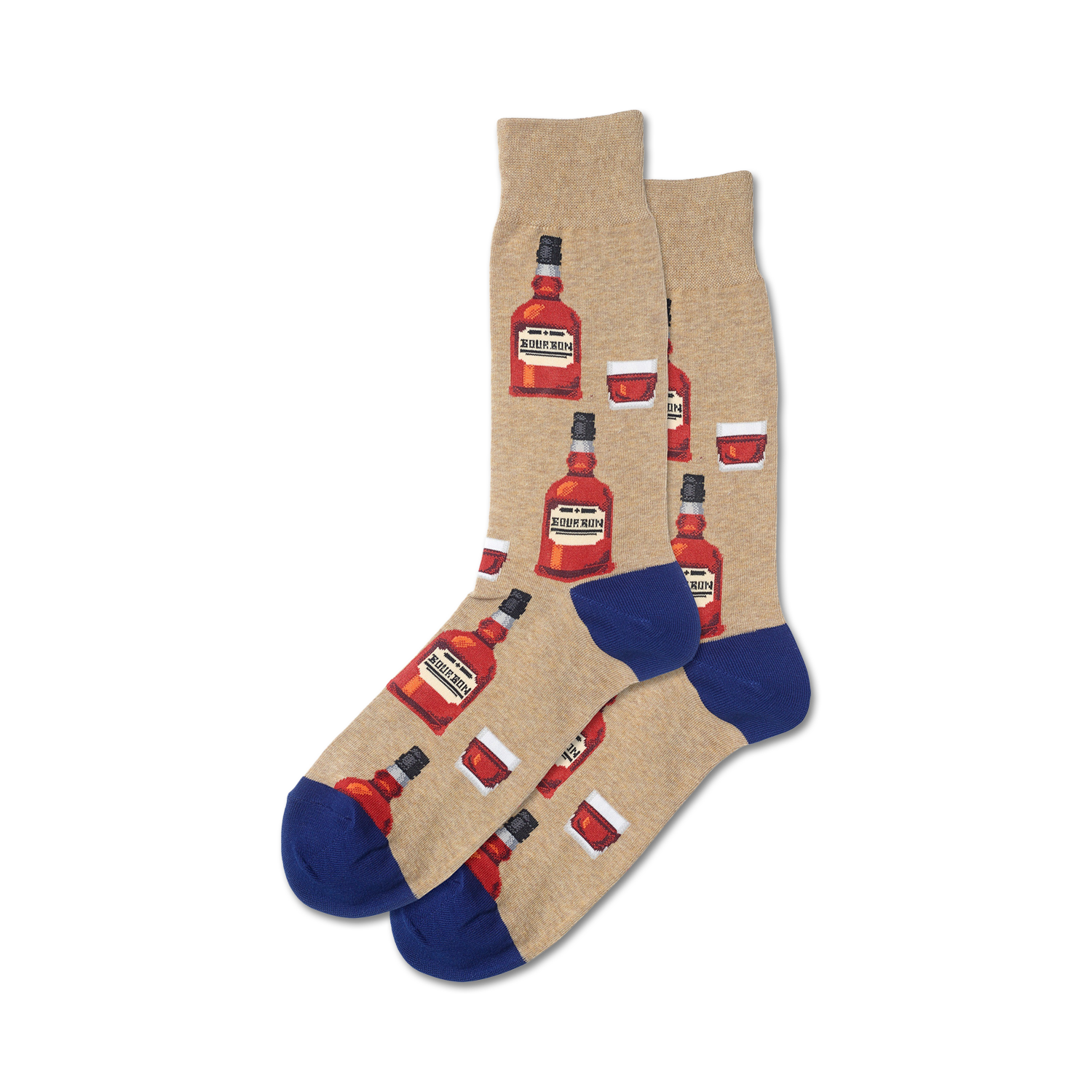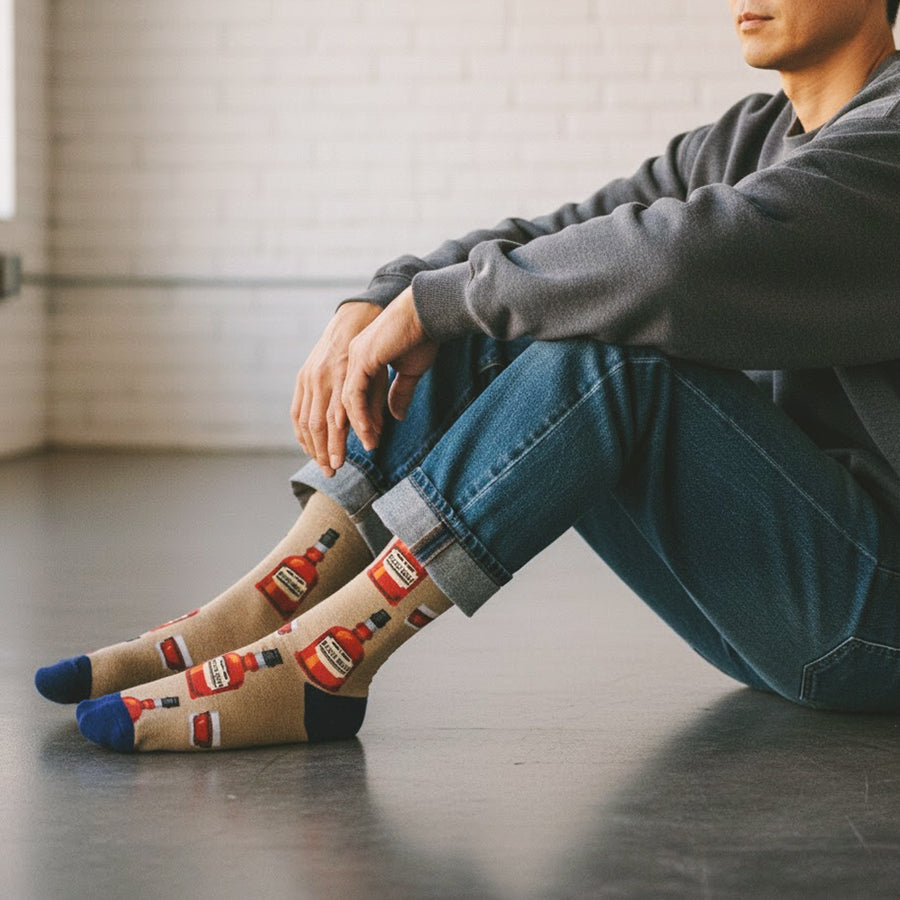 Bourbon socks: Sip, sip, hooray! These dark blue crew socks feature a pattern of brown bottles and glasses, perfect for any whiskey enthusiast. Wear these socks and you'll be the toast of the town!