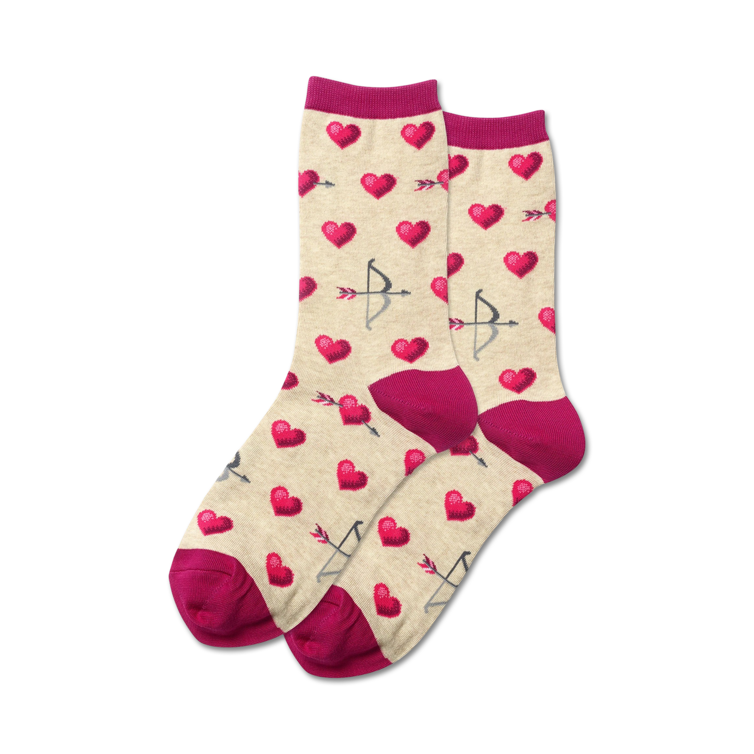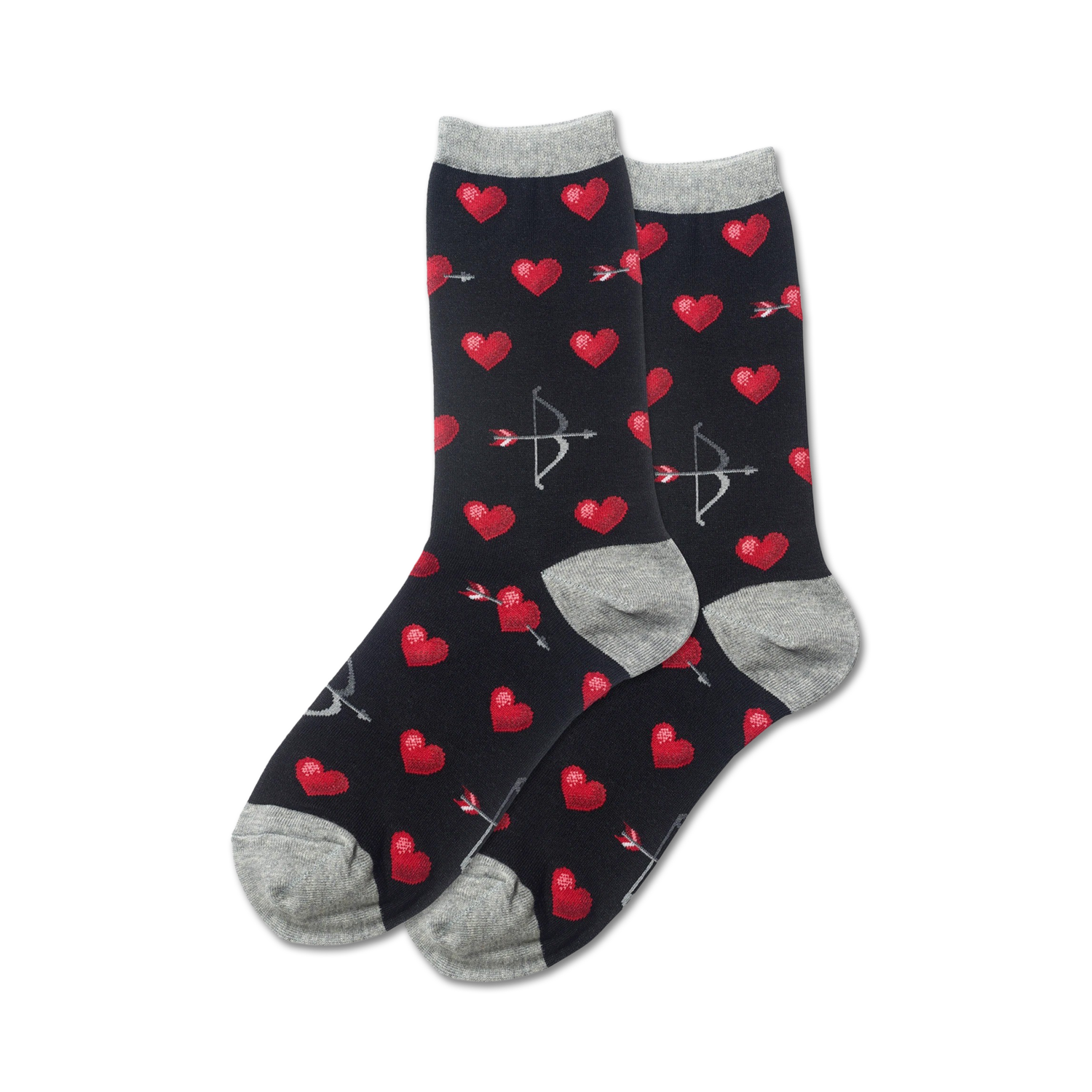 Aim and shoot straight for Valentine's Day with these precious Bow and Arrow socks. Featuring a design of red pixelated hearts and clean silver-gray arrows on a black background, these socks are a playful and loving way to show your affection. Whether you're aiming for a bullseye or just a lighthearted laugh, these crew-length socks for women are sure to hit the mark.