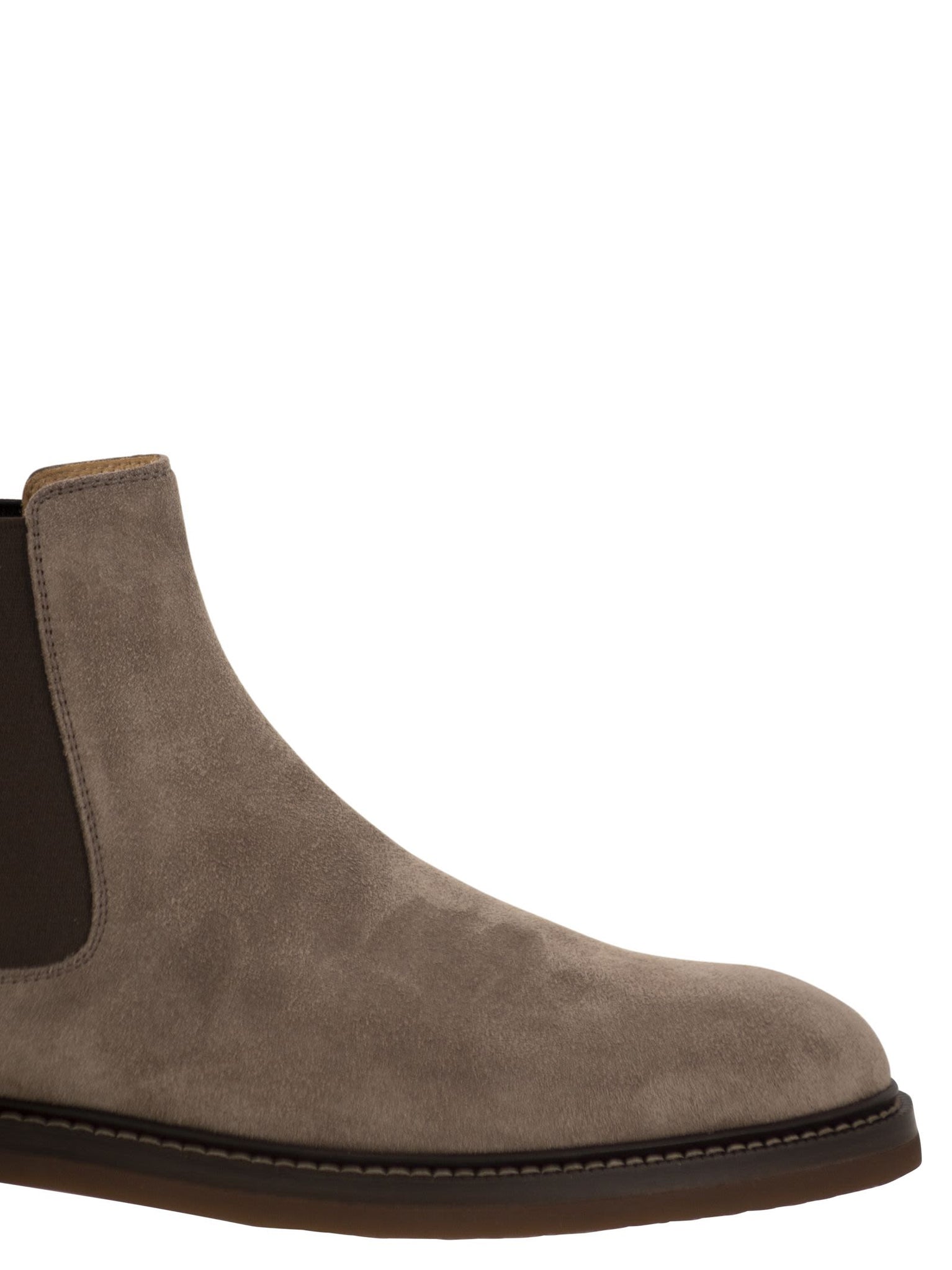 The casual attitude of the classic ankle boot is enriched through fine materials and a renewed silhouette in the suede Chelsea Boot. Slightly higher, to guarantee additional comfort and protection, it is distinguished by the mottled effect and unmistakable velvety texture of the leather, which enhances the season's nuances with a luminous colour effect. The finishing process using a special wax enriches the precious suede with a compact appearance and velvety touch. In addition, hand-brushing gives the toe and heel slight colour nuances that are more intense. The shoe is rounded off by the high-quality fibre inserts and the robust rubber sole. - Elastic side bands - Leather lining - Rubber sole DESIGNER ID: MZUPEAE818 C2637