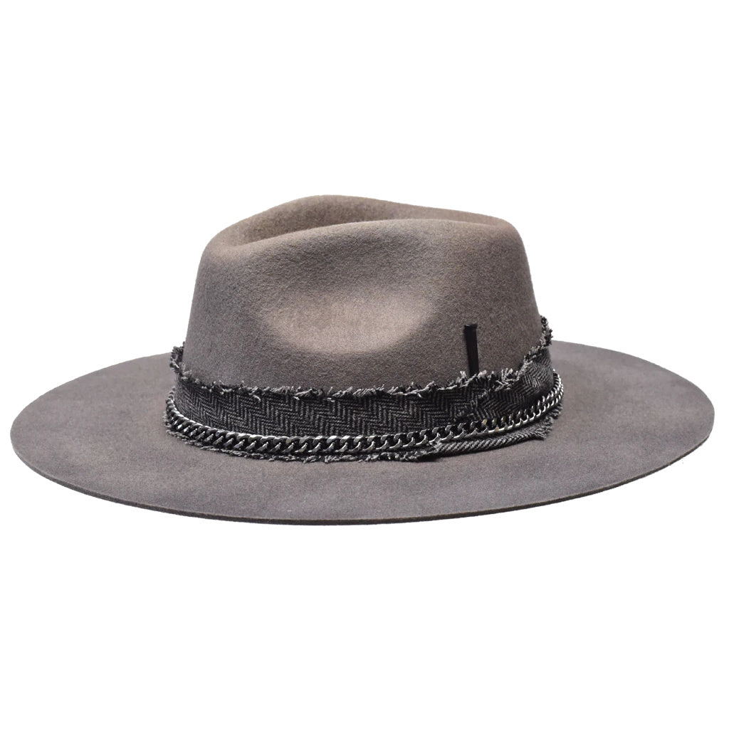 Feelin' a little edgy? Then, this hat is for you. Designed with a frayed band and a metal chain, this 3-inch wide brim hat will get you out of your fashion comfort zone...without going over-the-top. The body of the hat had a distressed effect so no 2 hats will ever look the same.