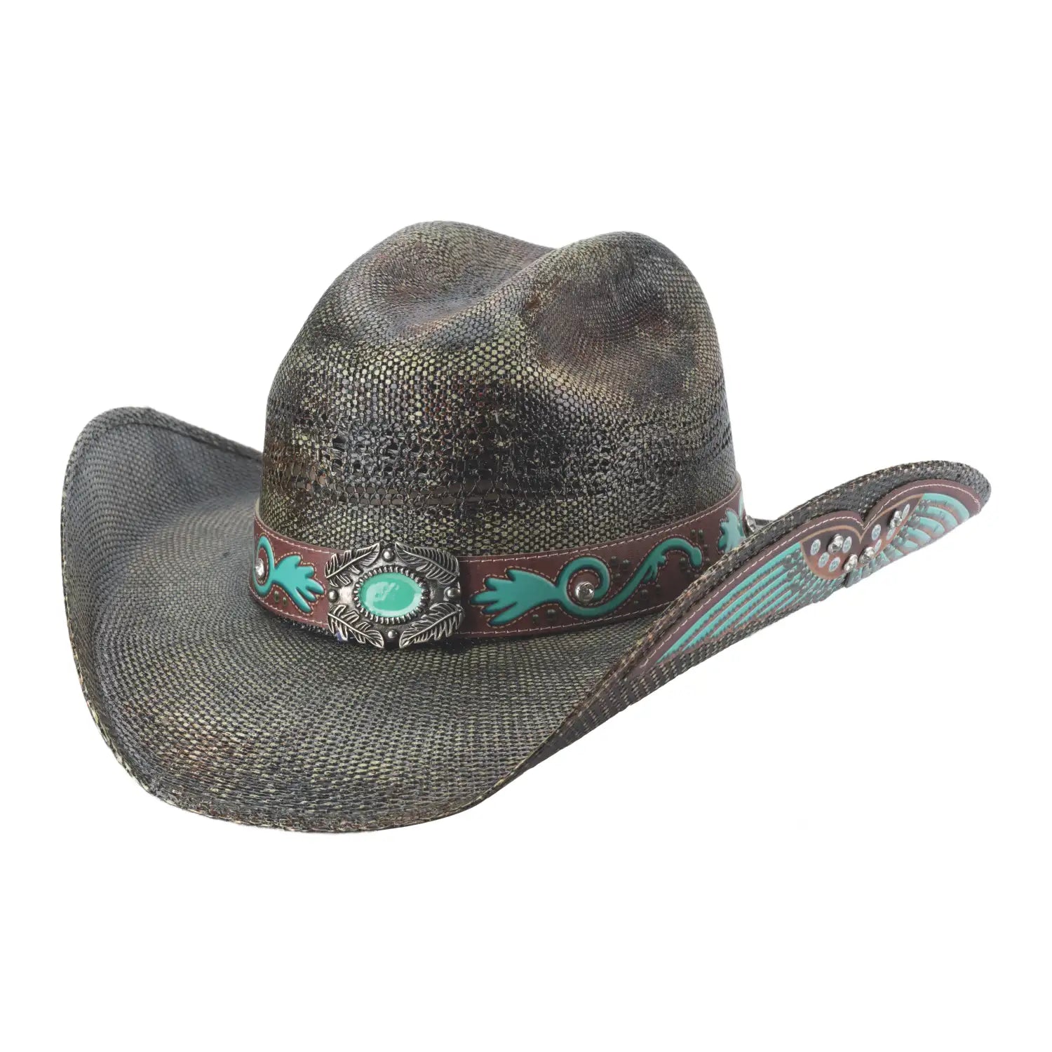 - Brown Leather Hatband with Embossed Turquoise Design, Silver Studs, and a Concho