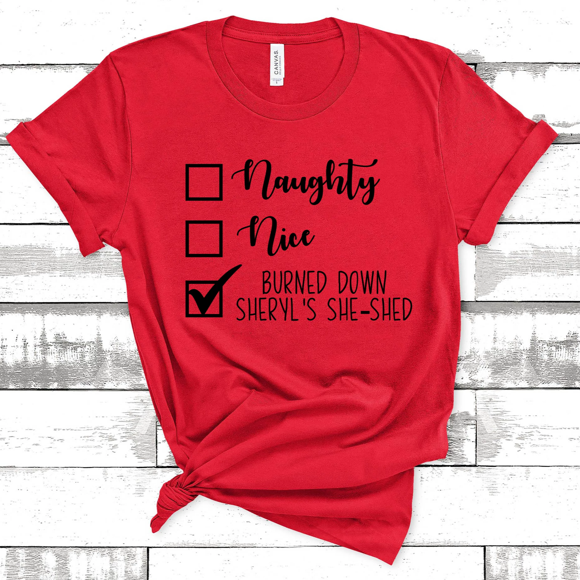 This soft and comfy Bella Canvas brand tee features the phrase "Naughty, Nice, Burned Down Sheryl's She Shed."
