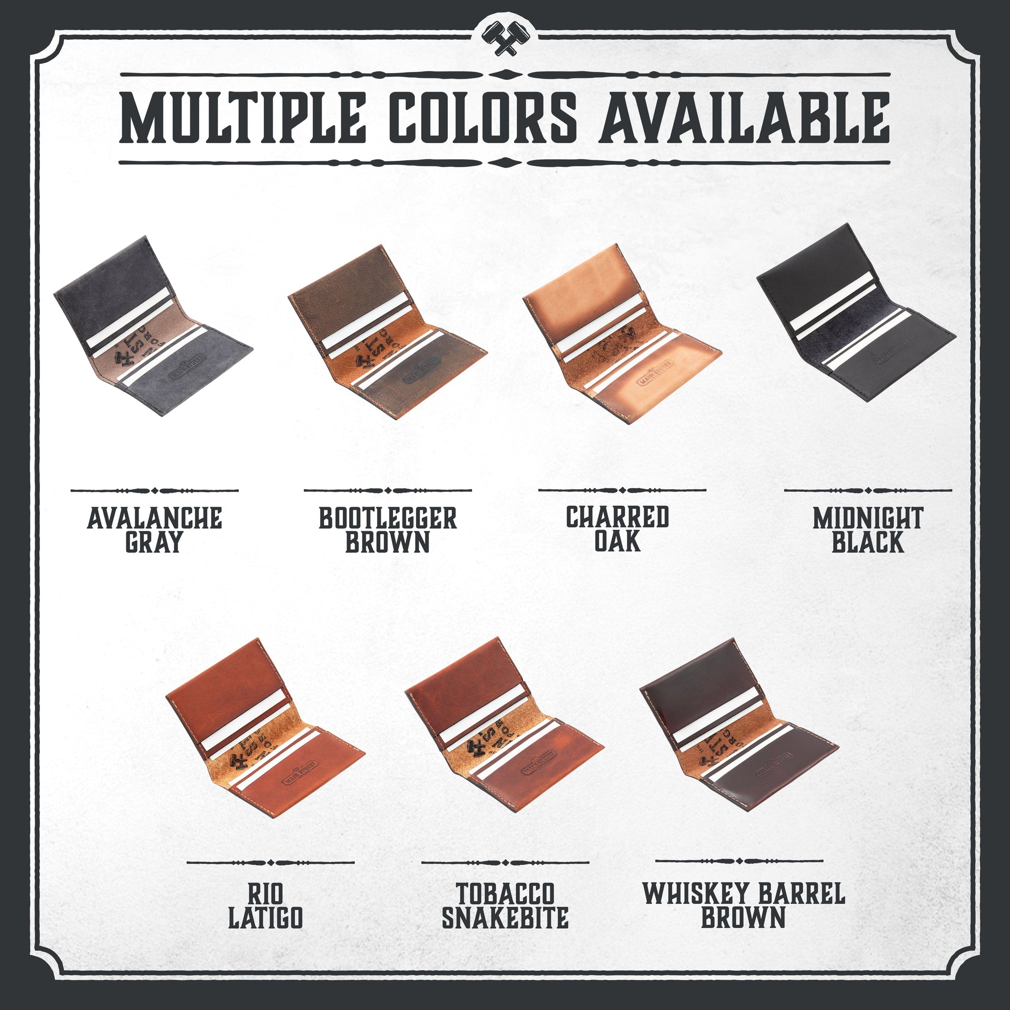 SUBTLY STYLISH - The best statements in style are always understated. These business card holders feature a slim, classic look with 7 unique colors: Avalanche Gray, Midnight Black, Charred Oak, Tobacco Snakebite, Whiskey Barrel, Bootlegger Brown, and Rio Latigo.