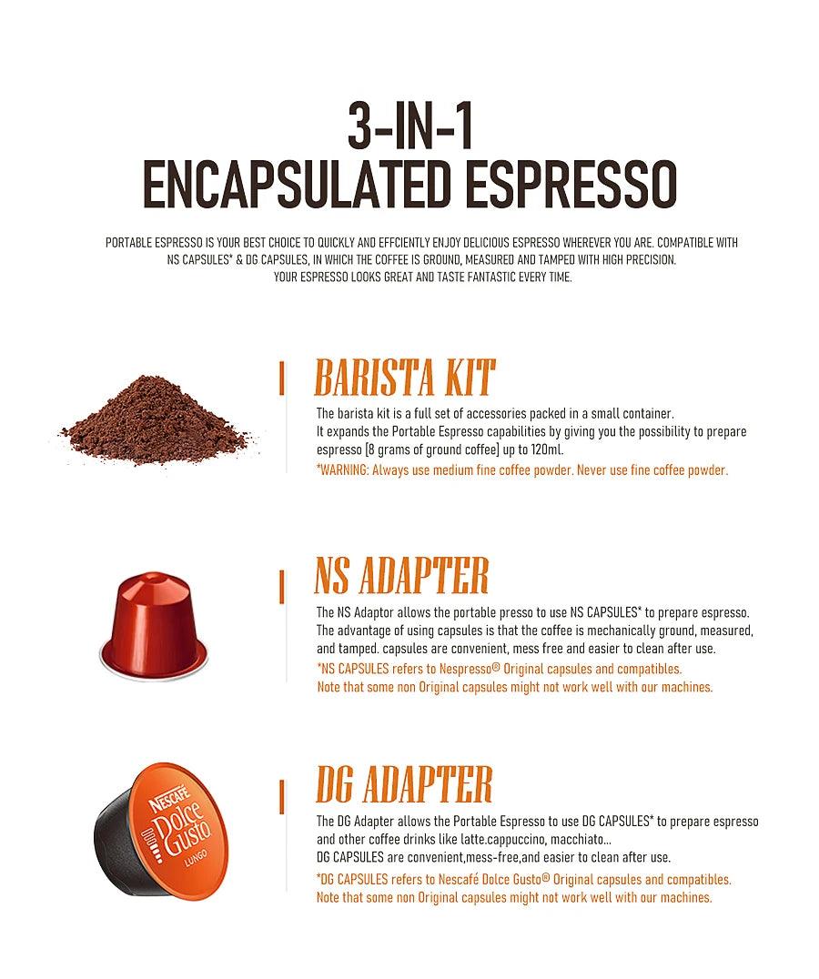 - 3 in 1 Functionality: Compatible with Nespresso capsules, Dolce-Gusto capsules, and ground coffee.