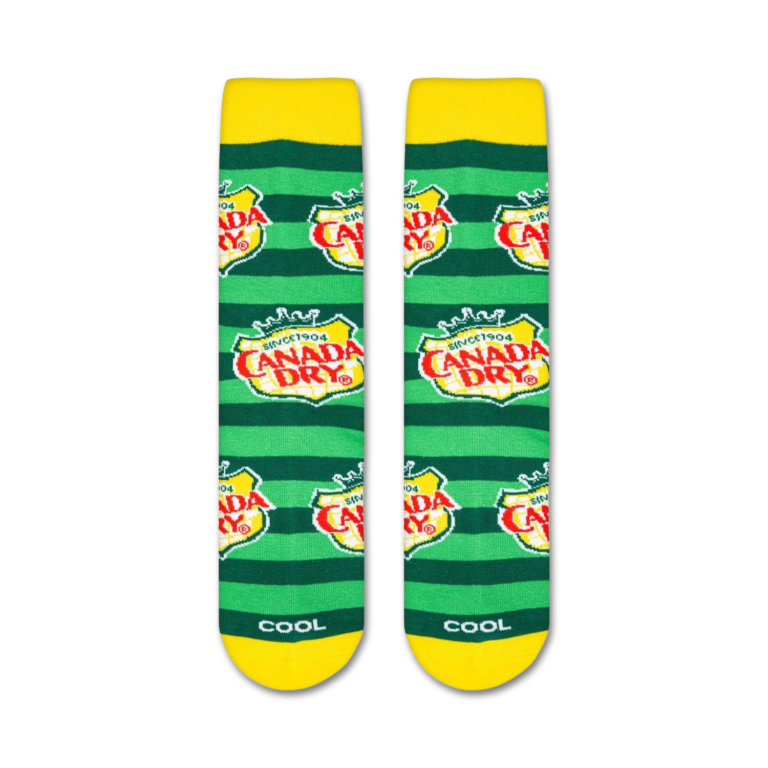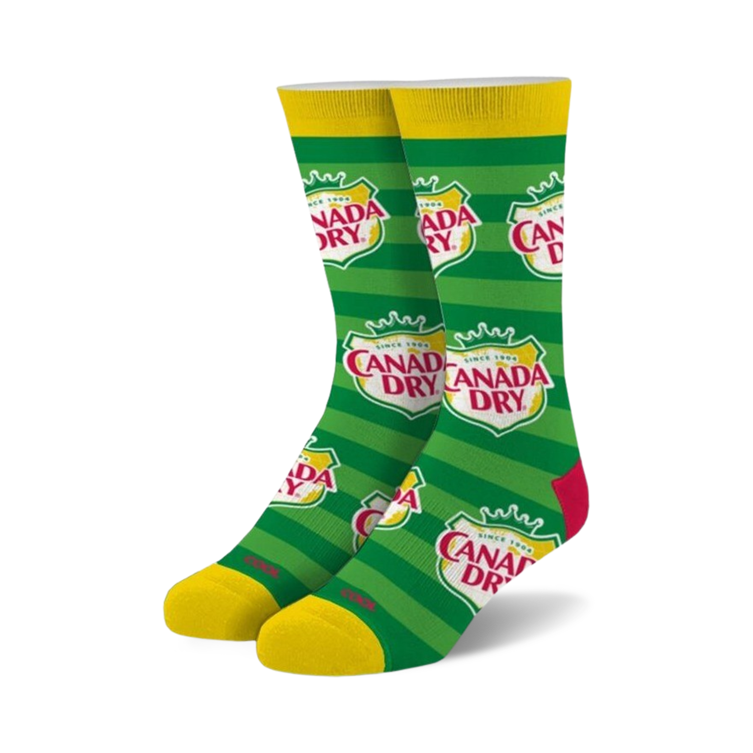 Gaze upon these socks ”a green spectacle with yellow toes, heels, and cuffs. Adorned with red shields, crowned in yellow, and emblazoned with the proud proclamation, "Canada Dry" in green, these socks are a tribute to the iconic ginger ale. A yellow stripe encircles the socks, adding a touch of zest. Don these socks, and feel the bubbly spirit of Canada Dry invigorate your feet.