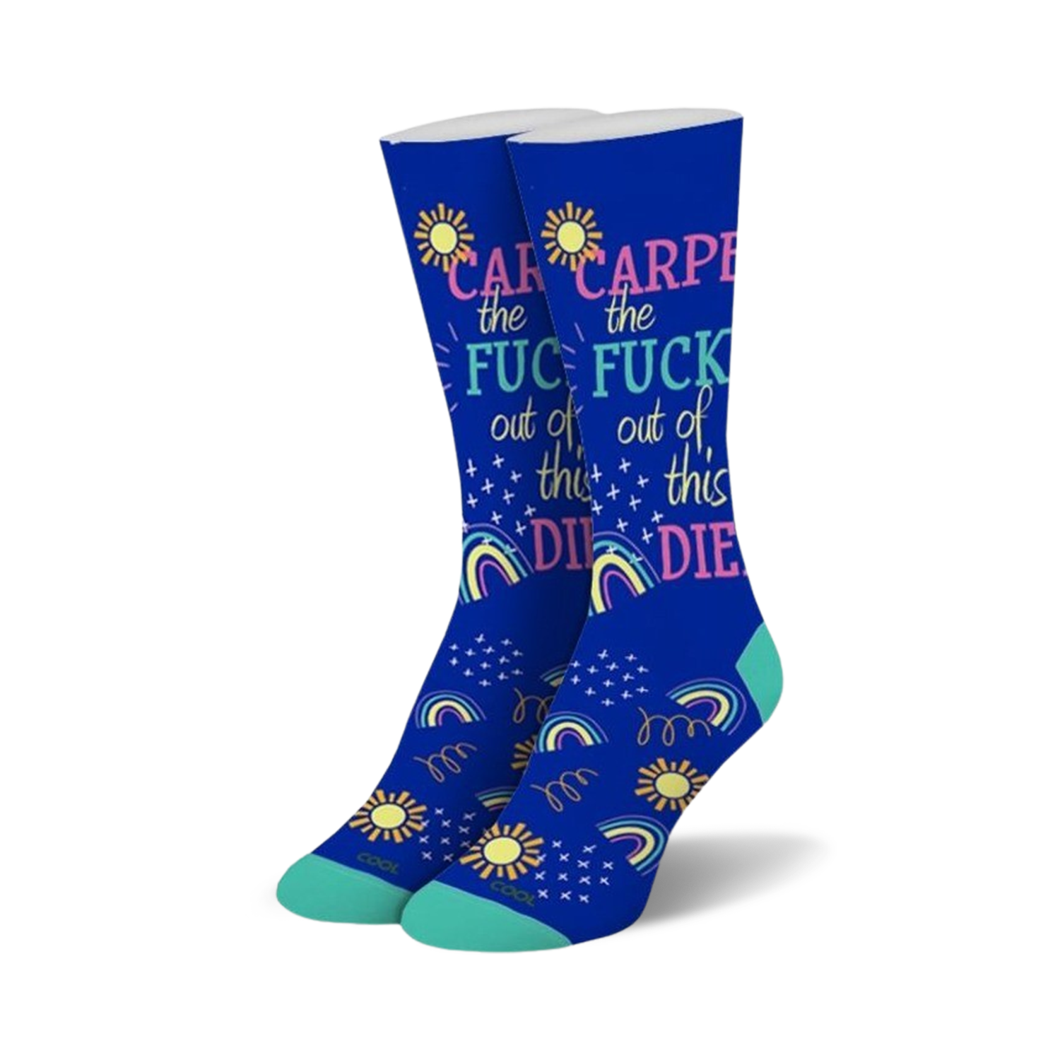 Feeling blue? Reach for our Carpe Diem socks to remind yourself to seize the damn day in style! With the phrase 'Carpe the Fuck Out of This Diem' emblazoned in vibrant lettering, these crew-length socks for women are a sassy accessory that adds a dash of humor to any outfit! Brighten up your day with a pop of color and an attitude that says, 'I'm grabbing life by the horns!'