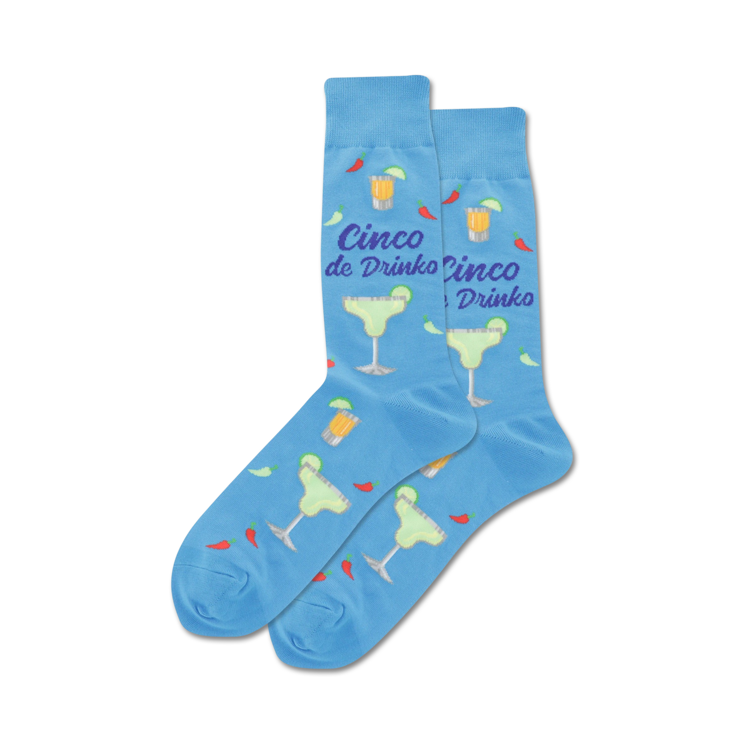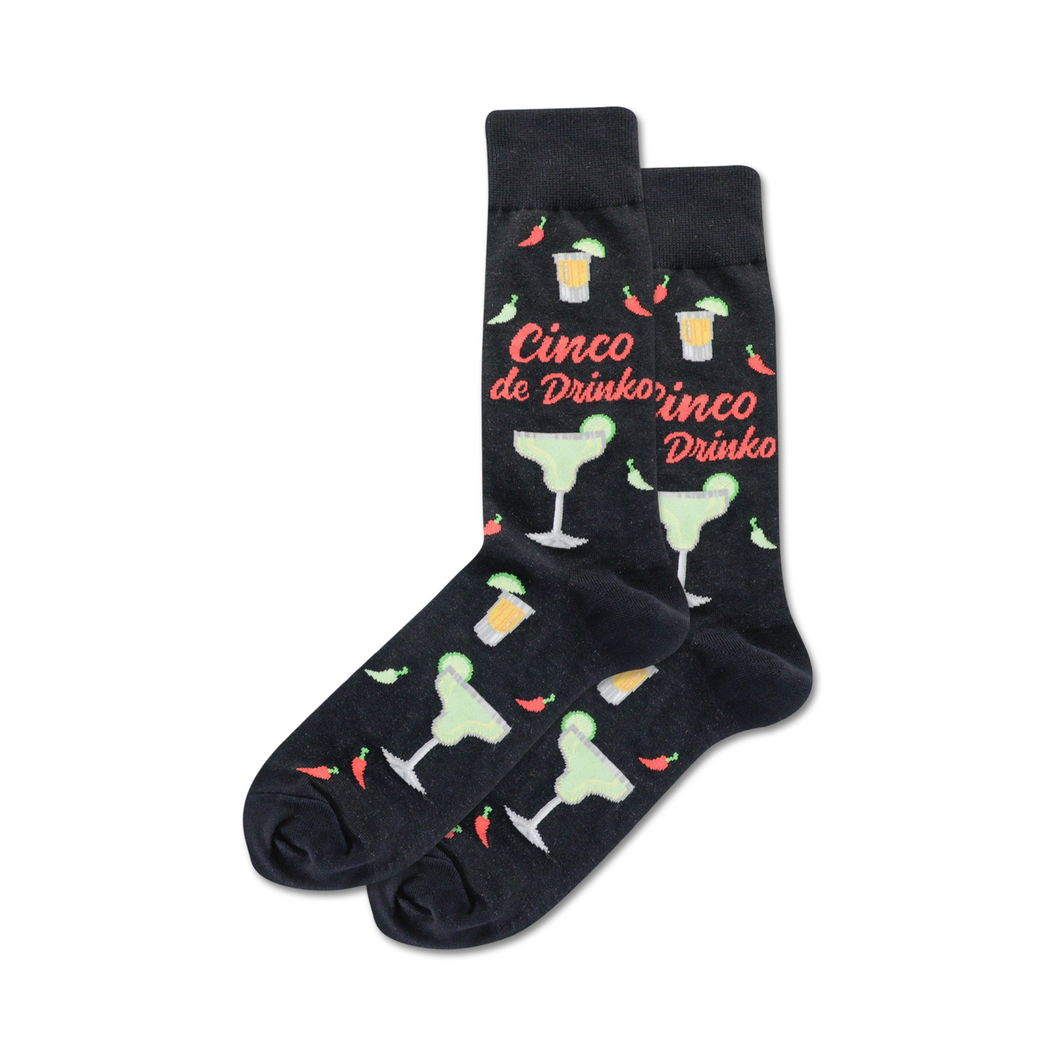Get ready to fiesta your feet in our Cinco de Drinko socks! These black crew socks are adorned with a pattern of margaritas, chili peppers, and the words "Cinco de Drinko." Whether you're hitting the dance floor or just kicking back with a margarita, these socks will keep your feet happy and stylish.