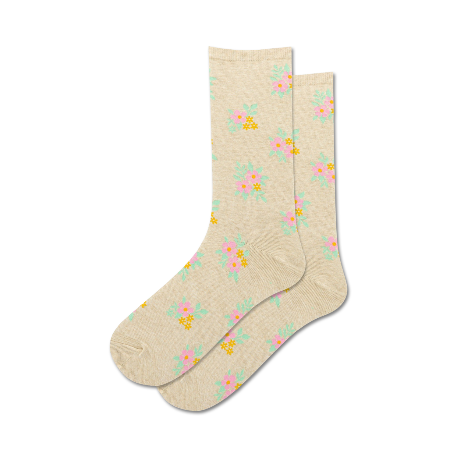 🌸🌼🌺 Bloom and behold! 🌼🌺🌸 Get your feet ready for a flowery fashion adventure with our Classic Floral Crew Socks! These socks for women are a burst of springtime delight, featuring a captivating pattern of small pink, yellow, and green flowers with light green leaves, against a beige background. Put them on, and you'll feel like you're walking through a secret garden, with flowers blooming at your every step. Whether you're dressing up or dressing down, these socks will add a touch of cheer and elegance to your outfit. So, slip into a pair and let the floral symphony bloom on your feet!