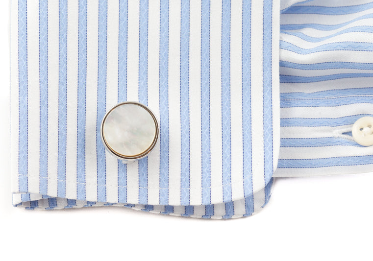 The Classic Tuxedo Set is, as its own name says it, the classical and fundamental addition to your cufflinks collection. With an undeniable air of cultivated taste, these cufflinks and studs are sure to make your outfit complete. Handcrafted with the fashionable Cuff-Daddy attention to quality and detail, this pair of cufflinks has a round-shaped mother of pearl as a centerpiece, mounted on a silver colored piece and bordered by a thin thread of silver layer. The pair comes with a great guarantee that assures you of the superior quality, all for a reasonable price.