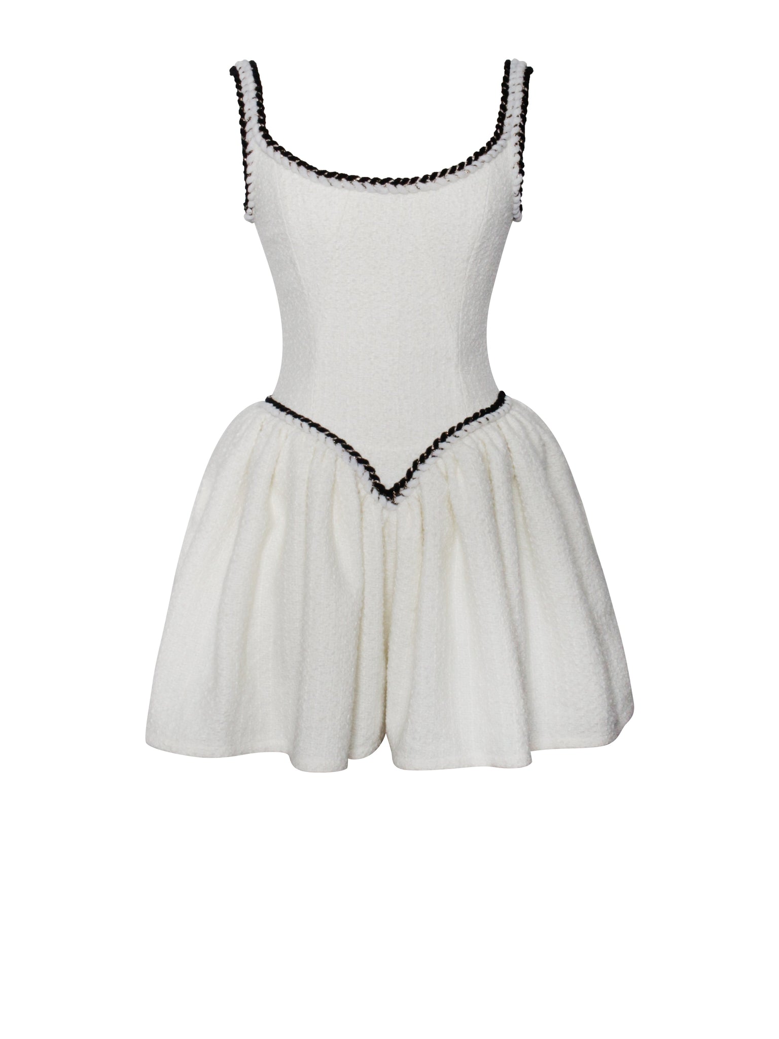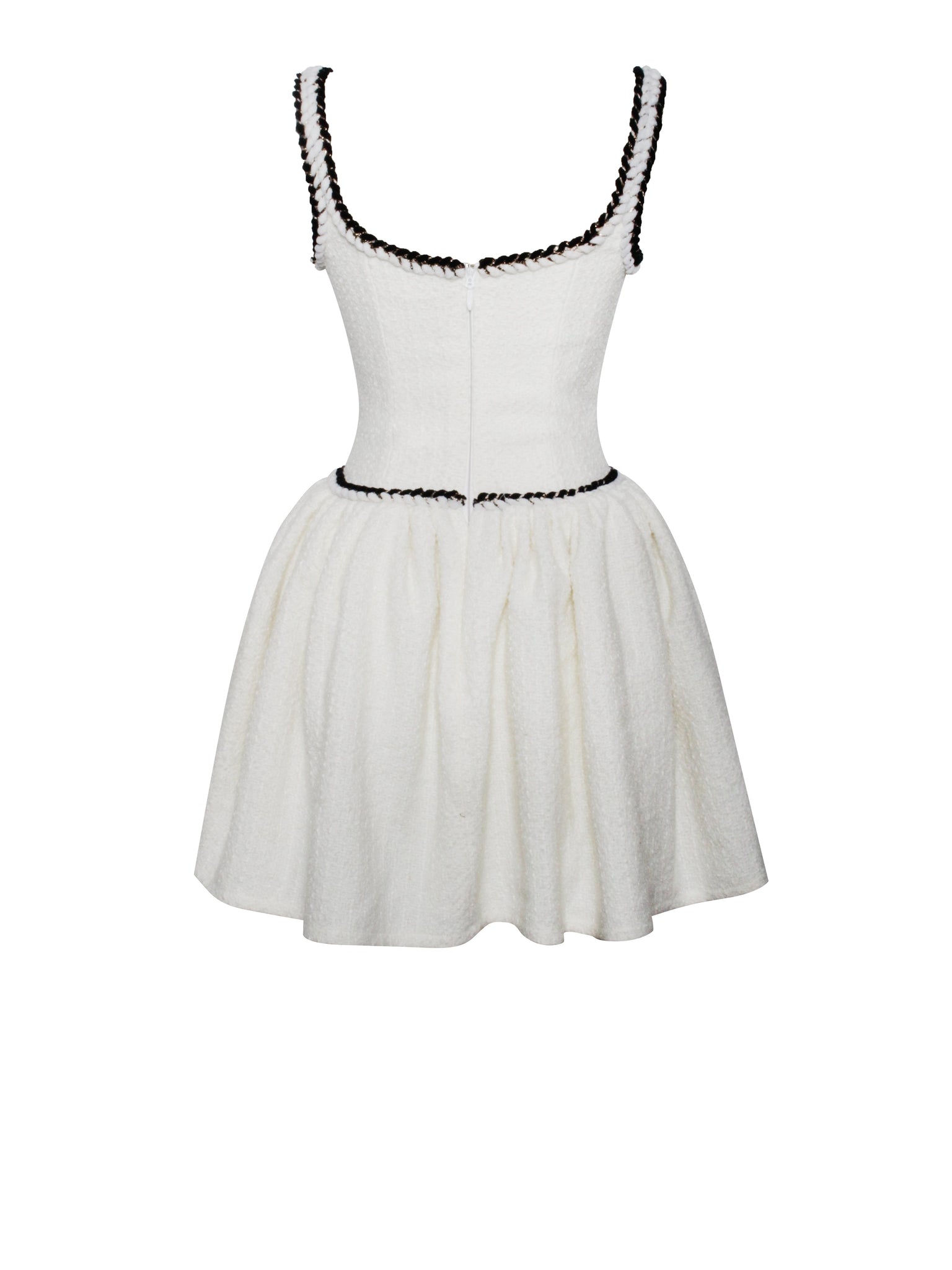 Introducing the Coco mini dress, a classic and timeless piece crafted from luxurious boucle fabric. This elegant dress features a low-cut neckline and is beautifully trimmed, adding a touch of sophistication. The supported skirt, combined with built-in bones, ensures a flattering and structured fit. An invisible zipper provides a seamless finish. Perfect for all occasions, this mini dress effortlessly blends style and grace, making it a staple in any wardrobe.