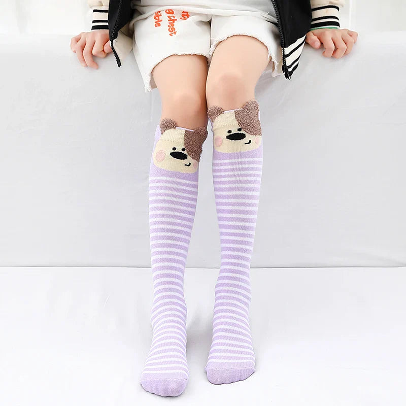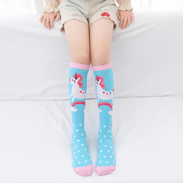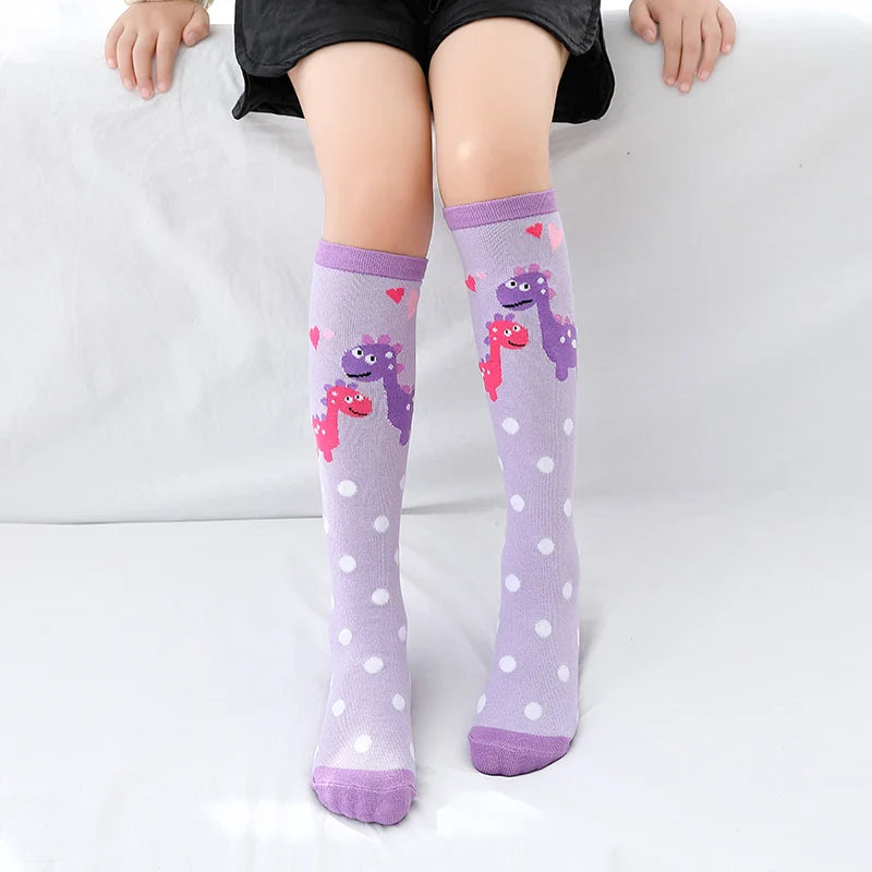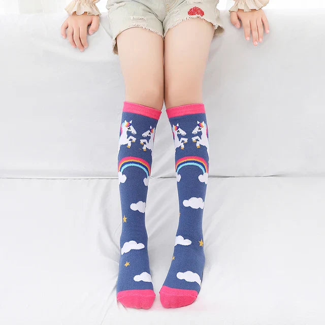 These knee-high socks are adorned with colorful embroidery, making them a fun and stylish addition to any girl's wardrobe. The unique design adds a pop of color to any outfit, while the knee-high length provides extra warmth and comfort. Perfect for young fashionistas.
