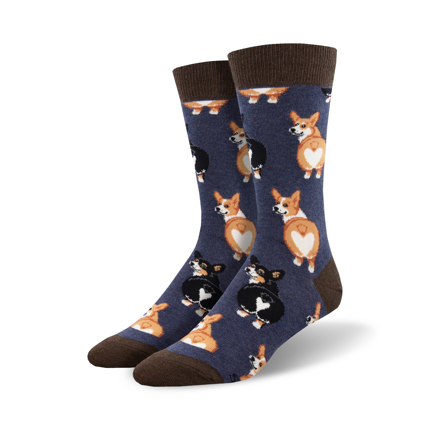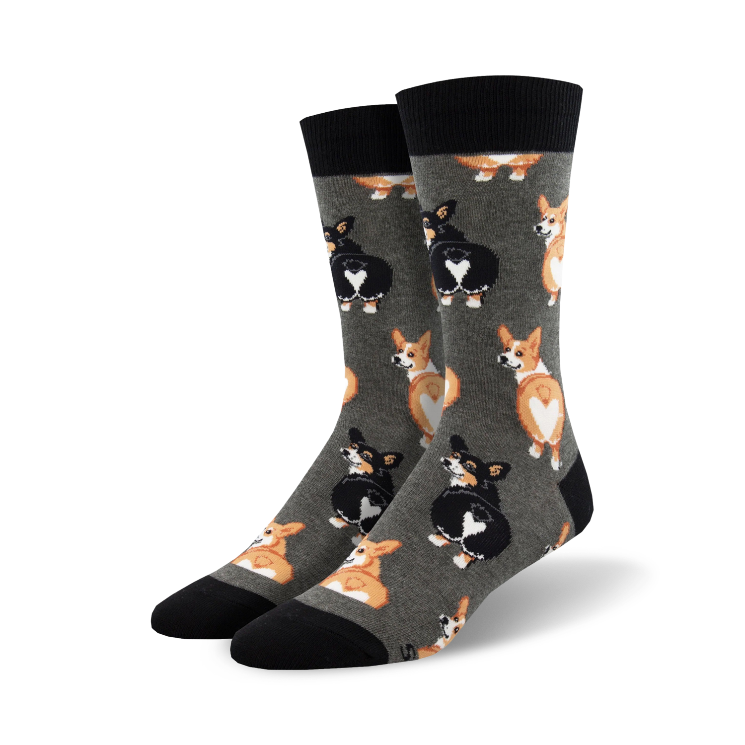 Corgi Butt Crew Socks: Happiness for Your Feet! Gear up in these adorable corgi butt socks and unleash your inner doggo! Featuring a paw-some pattern of fluffy corgis in black, brown, and white, these socks are sure to put a spring in your step and wag in your tail. These crew-length socks are the perfect accessory for any dog lover, or anyone who needs a little bit of cheer in their day. Happy feet, happy life!