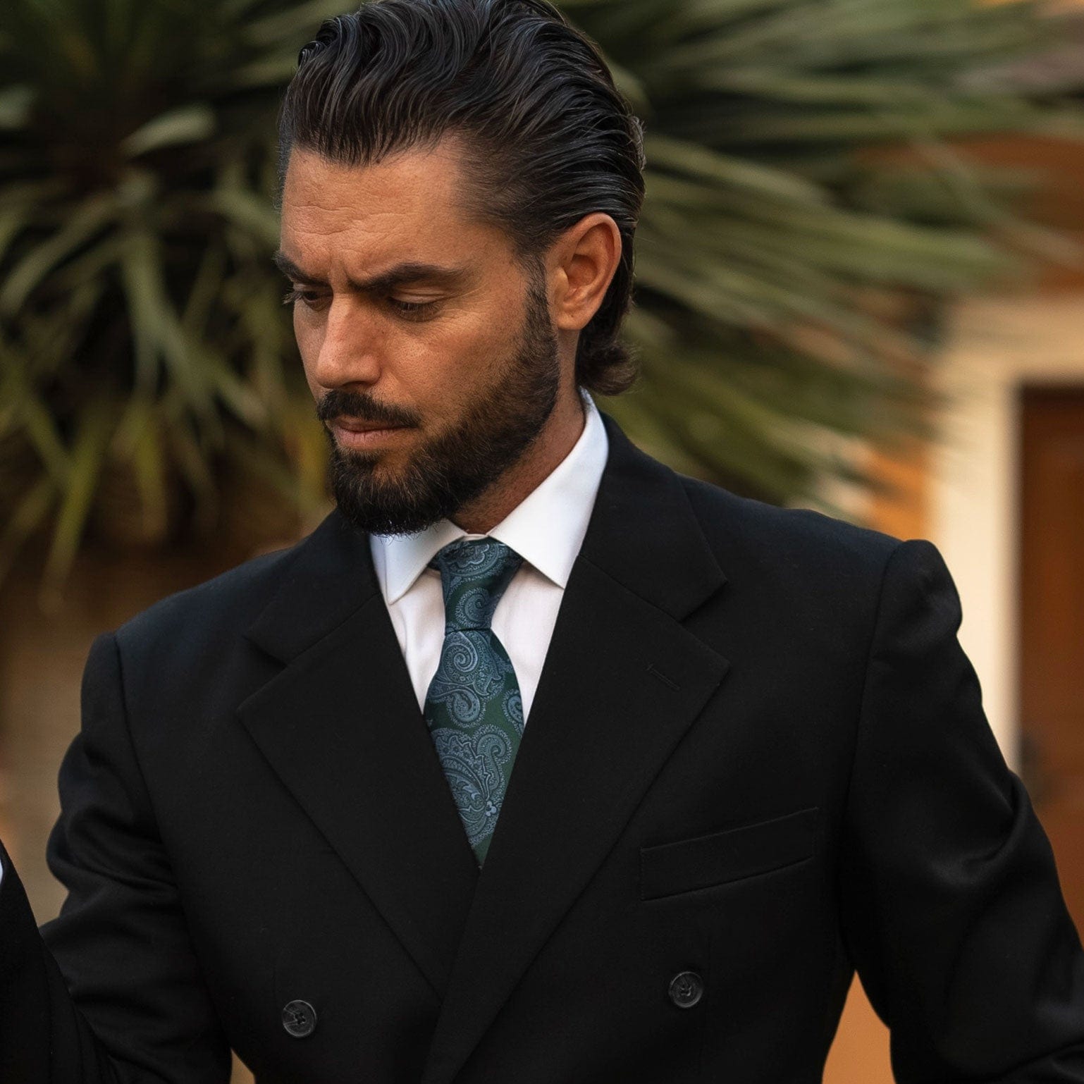 This tie captures that timeless elegance and refinement. Handcrafted in Italy from the finest silk in bottle green and silvery shades of blue, it adds a touch of sophistication to any outfit, a testament to your impeccable taste and appreciation for the finer things in life.