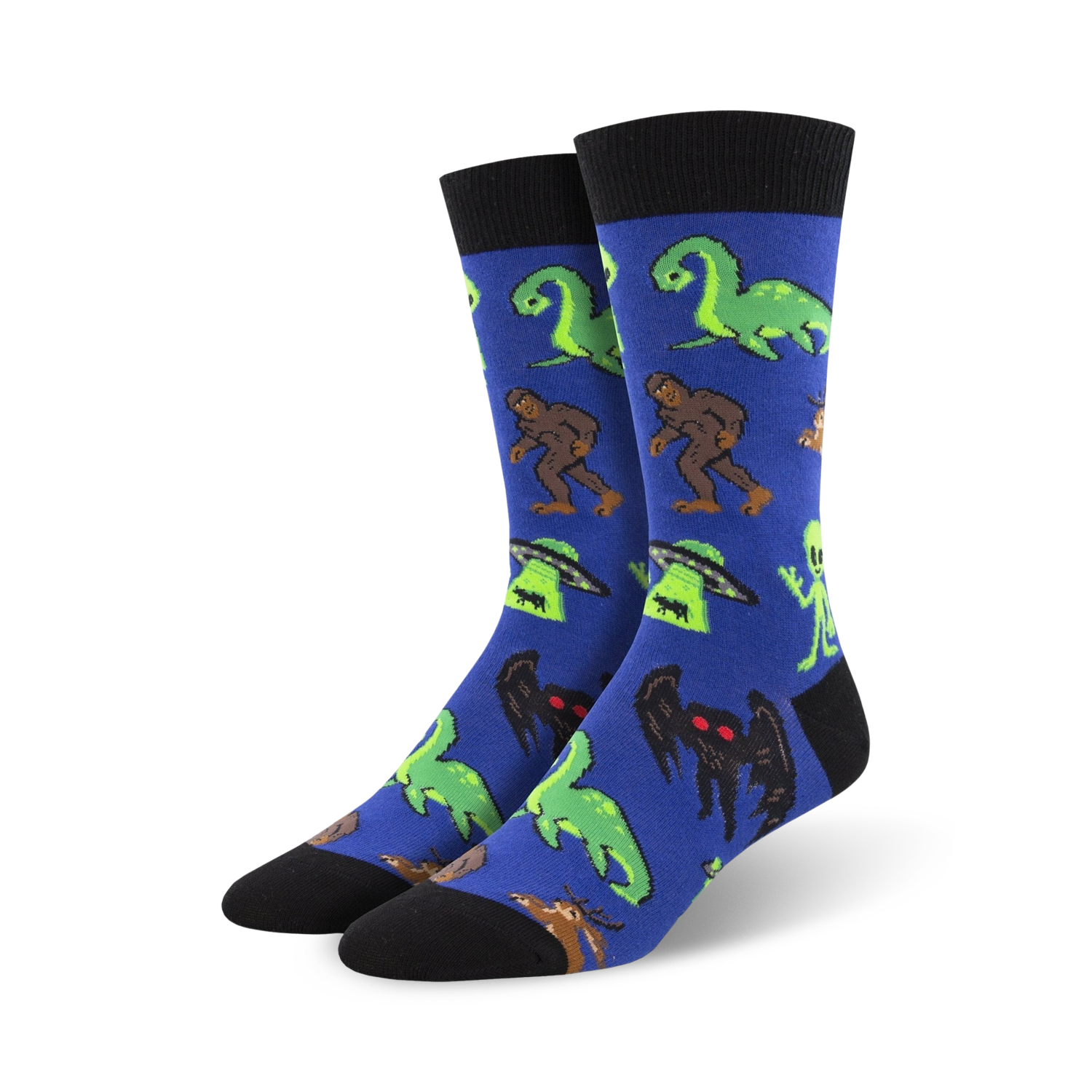 Unleash your inner believer in the unexplained with our Cryptids socks! These gray crew socks feature a mythical menagerie of Bigfoot, Nessie, UFOs, Jersey Devil, Mothman, and Chupacabra. They're a fun and unique way to add some mystery to your everyday wardrobe. Who knows, maybe they'll even help you uncover some hidden truths (or just make you the life of the party).