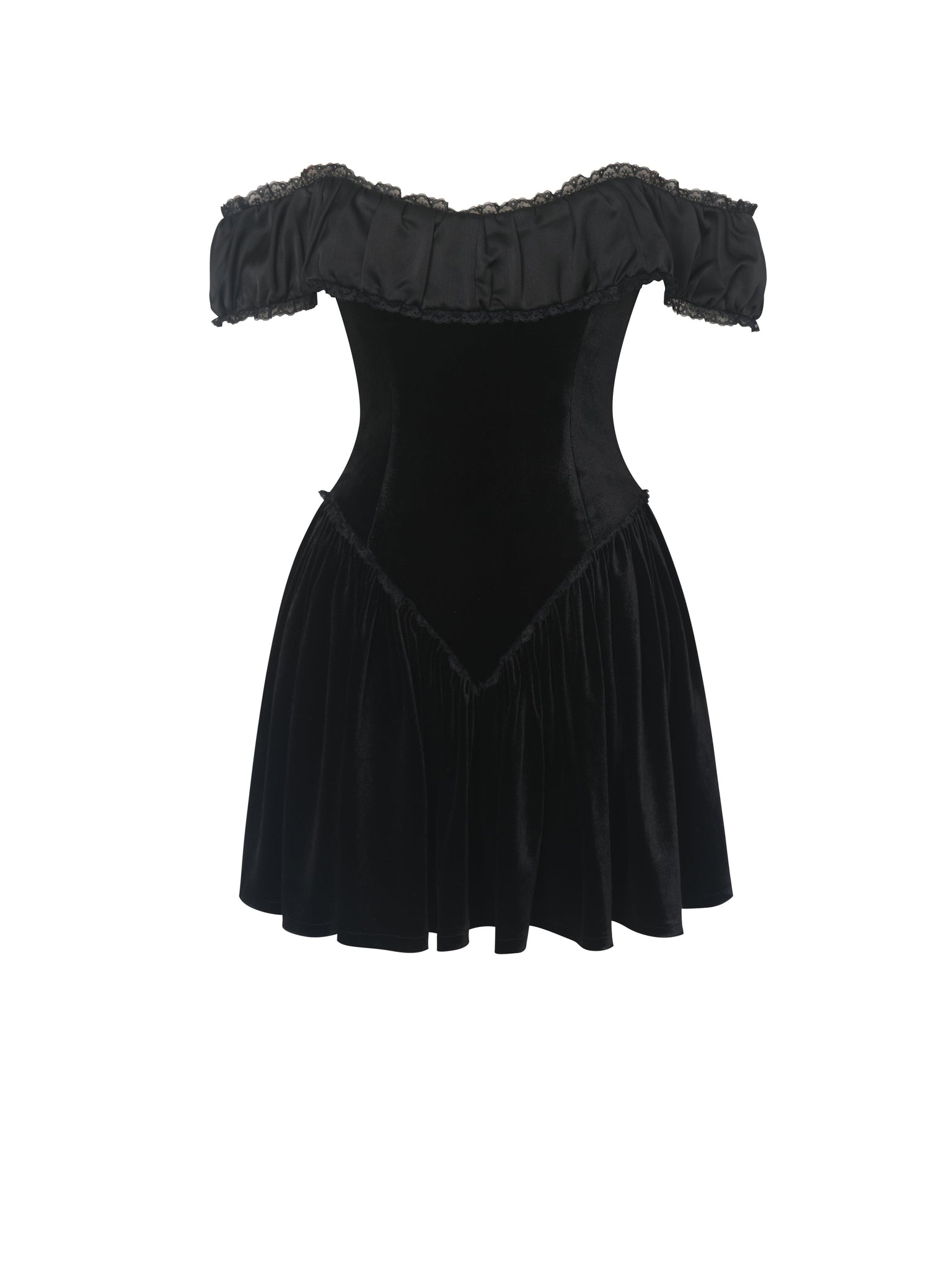 Perfect for candlelit dinners, rooftop toasts, and every festive affair in between, the Daisha Dress delivers velvet decadence with a flirty twist. This black off-the-shoulder mini stuns with a ruffled lace neckline and ruched satin bust, bringing soft romance to a sculpted silhouette. A built-in corset and princess seams cinch and flatter, while the low-waisted A-line skirt flares out just enough for a dramatic exit. Lined in satin and finished with an invisible back zipper, it’s made for the nights you know you'll steal the spotlight—no paparazzi required.