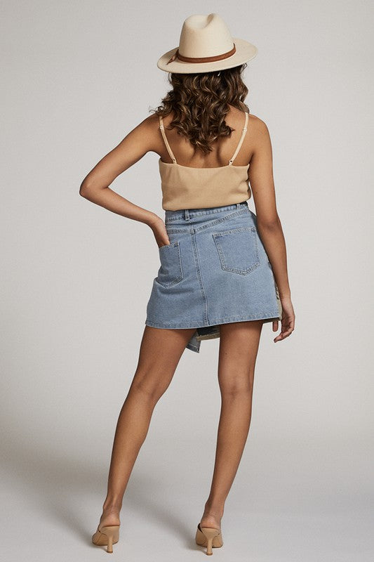 *Exclusive in house design*-Wrap denim skirt with contrast fabric-Button on front and inside waistband for secure hold