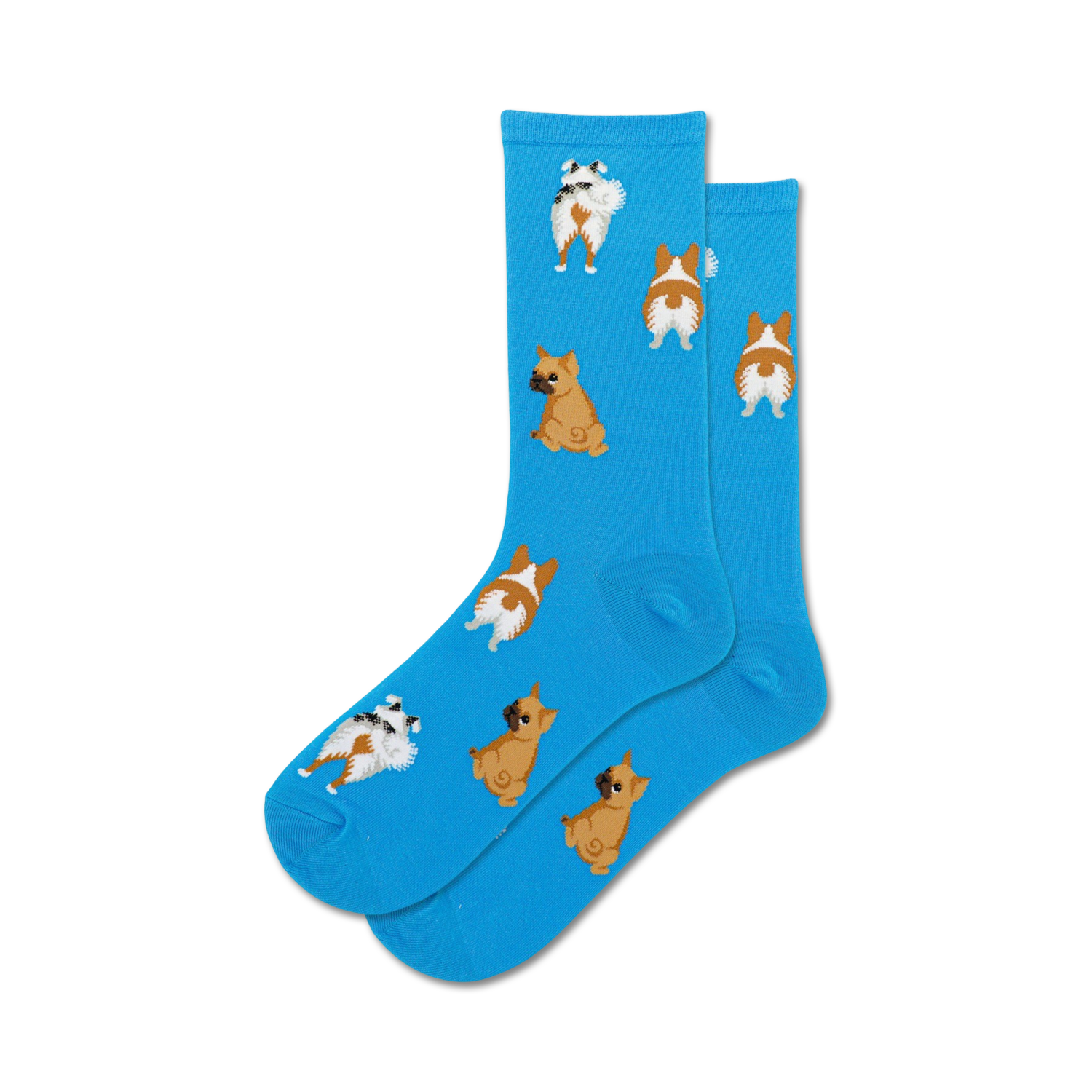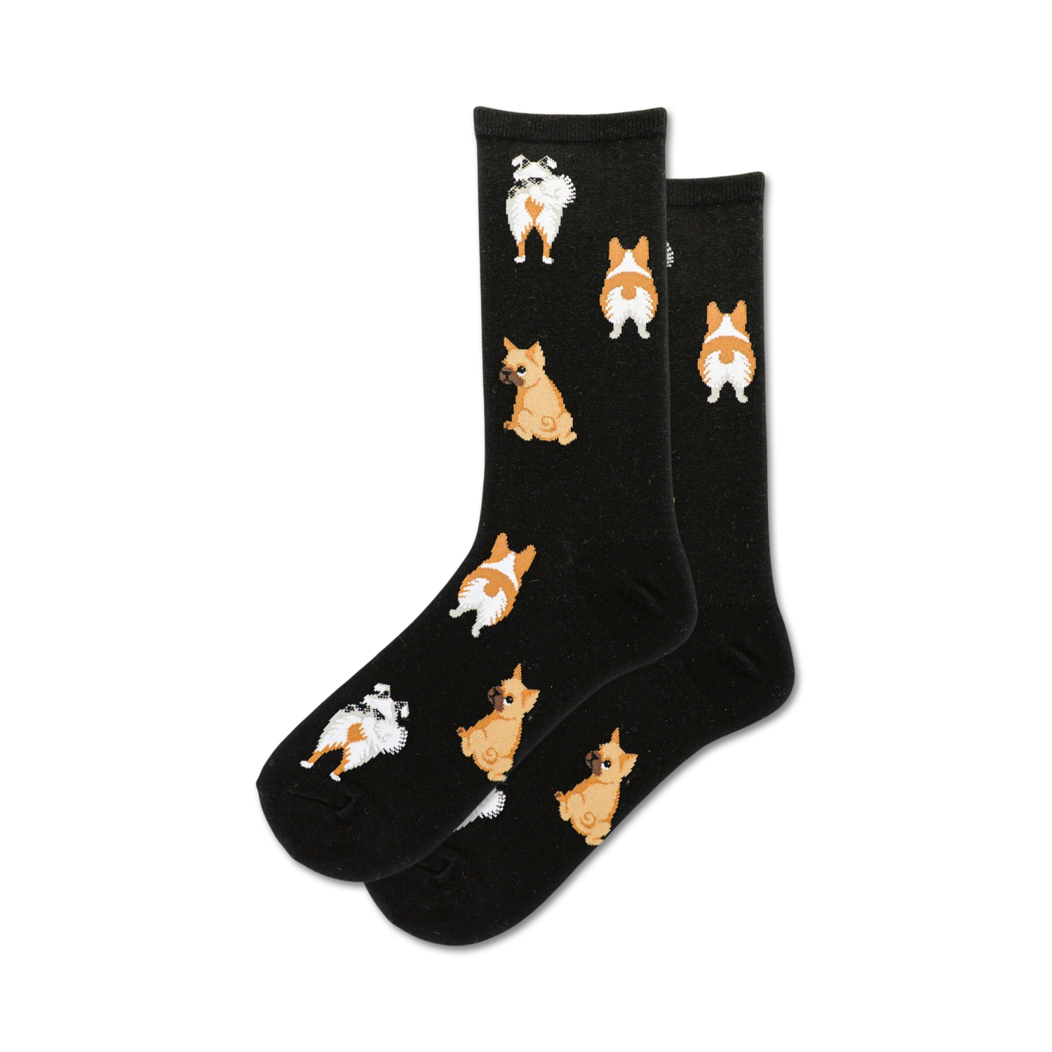 These Dog Tails crew socks for women are a paw-some way to show your love for our furry friends. With a playful pattern of cartoon dog butts in various breeds and colors, these socks will put a smile on your face and the faces of those around you. So, go ahead, let your inner doggo run free!