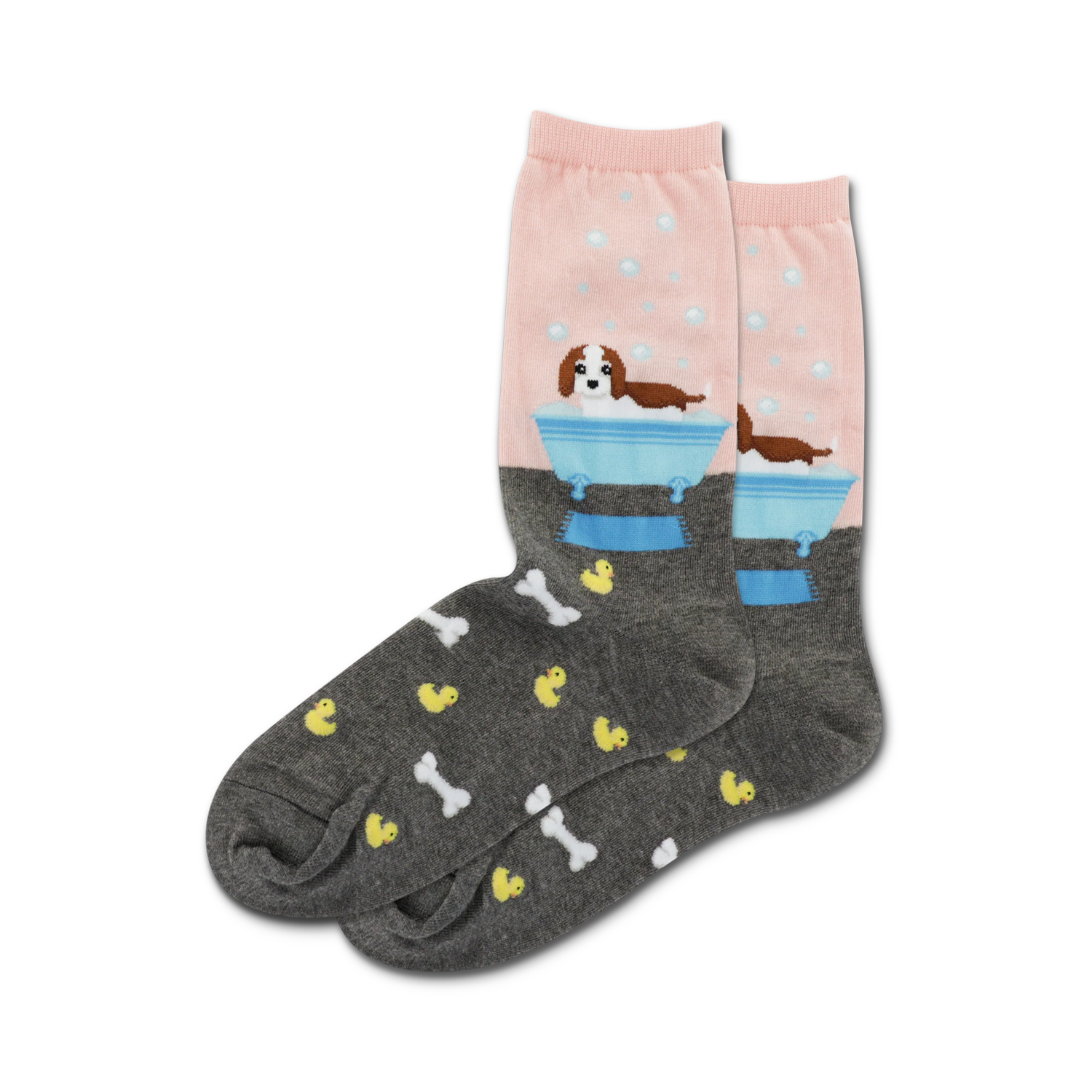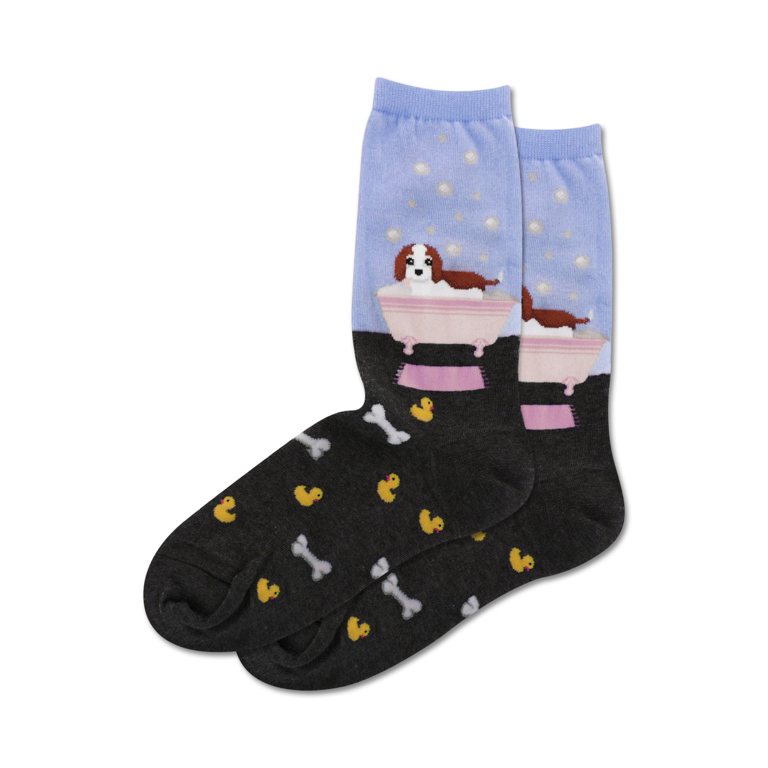 Who let the dogs out? Doggie Bath Time socks let you take your furry friends wherever you go. Don't worry if they get dirty, they're machine washable! These crew length socks feature a pattern of yellow rubber ducks and bones on the black part of the socks with a bathtub with a dog in it on the blue part. They're cozy, comfortable, and stylish. You won't want to take them off, even after bath time is over.