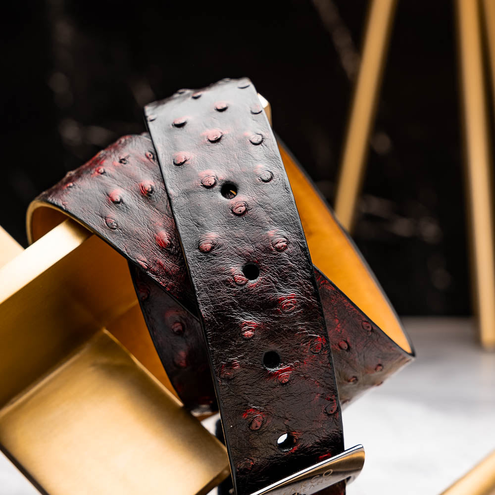 Finish your look with our genuine exotic ostrich belts, featuring beautiful antiqued hand-finishes and soft interior lining. The brushed chrome buckle features subtle Marco Di Milano branding, and it easily removable in case you need your belt trimmed to size.
