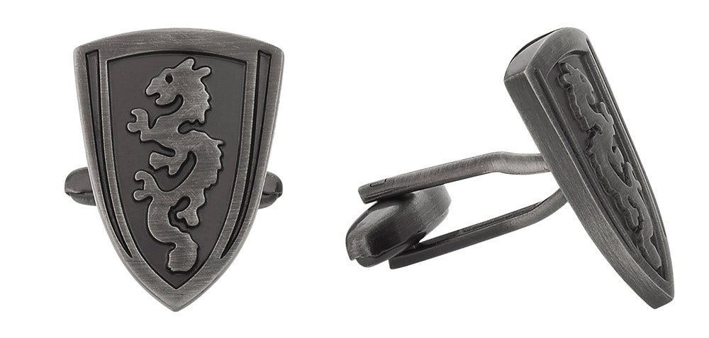 Show everyone what kind of warrior you are by sporting these shields at your sleeves! Featuring a dragon in its center, each piece, made to look aged and vintage, is 15/16" x 5/8" inch in size. One of the most iconic symbols of strength and power, the dragon has been used for centuries to exude these qualities. Their neutral, silver color makes these cufflinks extremely easy to match, although they may not be suited for all types of events. Each set you buy will come nicely packaged in a neat gift box.