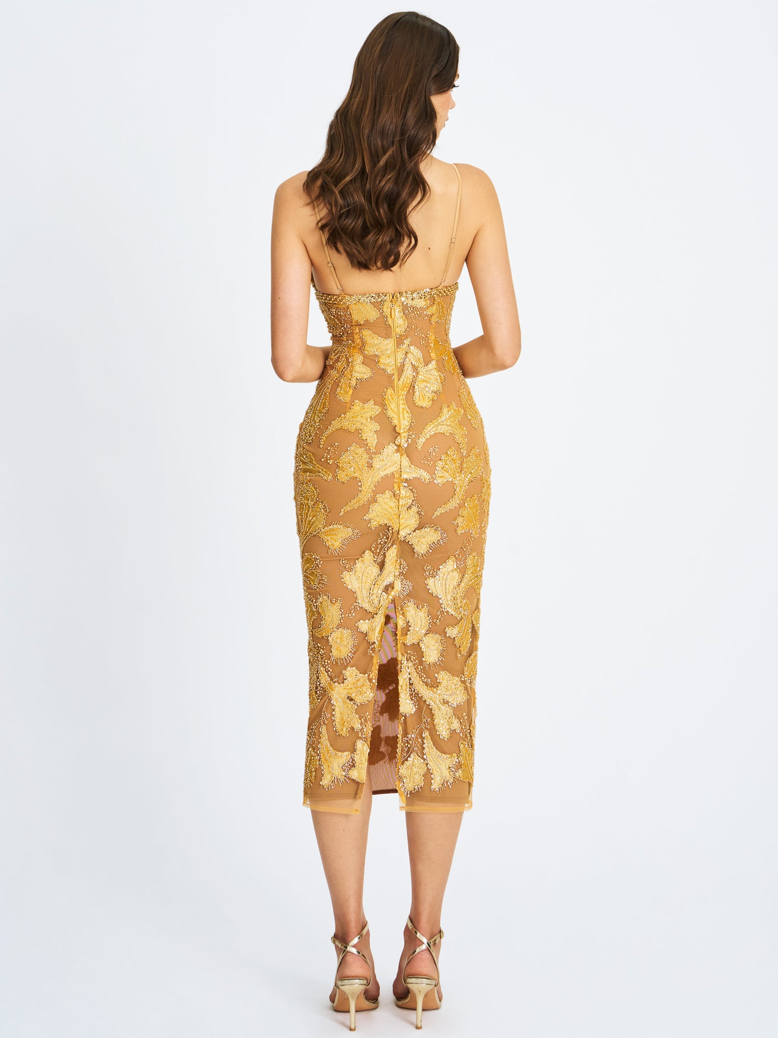 Elevate your evening wardrobe with the Edie Dress in a radiant golden bronze hue. Dusted in intricate beadwork, this V-neck silhouette shimmers like a spellbound constellation, each glimmer catching the light with celestial charm. Nude mesh lining offers subtle coverage, while adjustable straps and a back vent ensure comfort and graceful movement. Blending floral allure with refined elegance, it’s finished with a back zipper for a smooth fit. The Edie Dress is a dazzling choice for cocktail hours, star-lit celebrations, or whenever your horoscope calls for main-character energy.