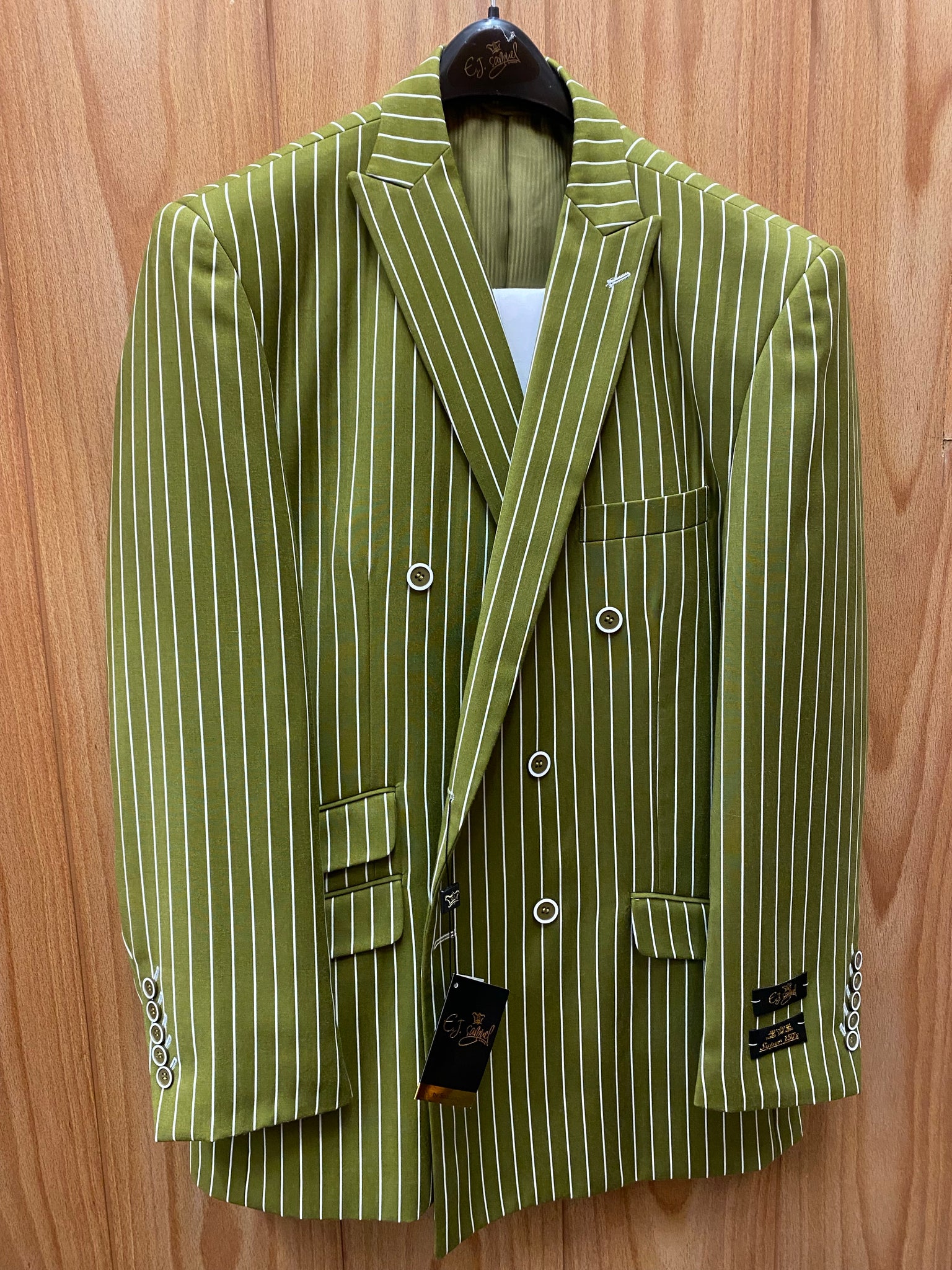 EJ Samuel Olive/White Pinstripe Double Breasted Blazer 44R