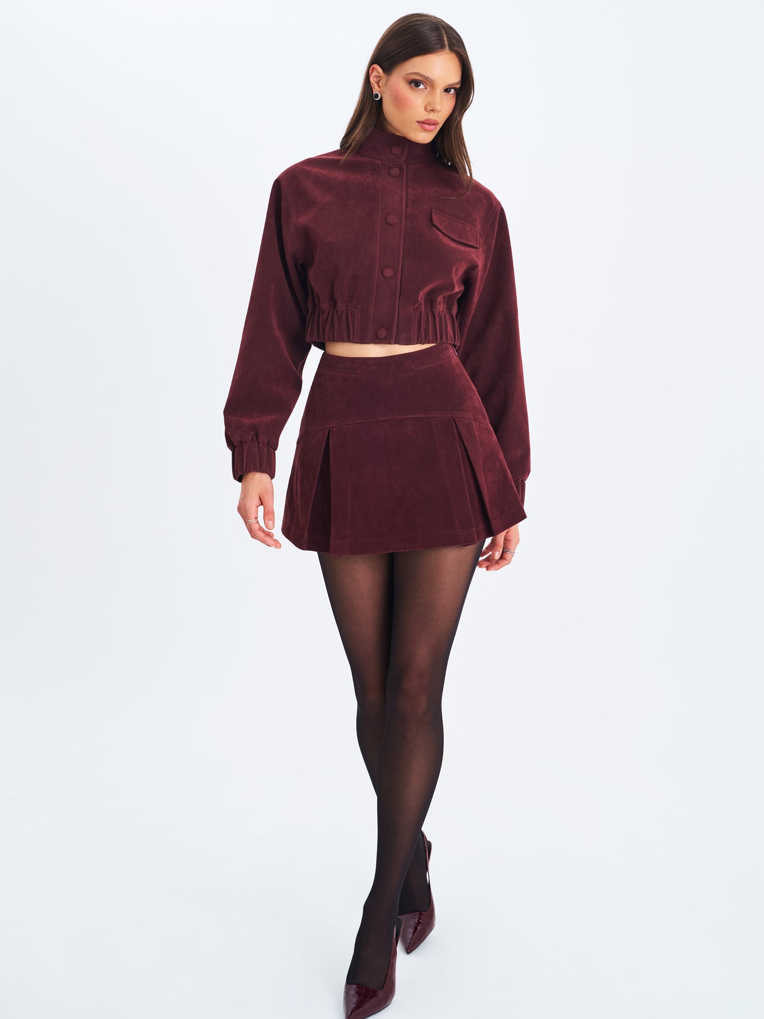 Polished structure meets everyday ease in the Faryn Skirt. Crafted from soft vegan suede in a rich mahogany hue, this A-line mini features wide pleats for volume and movement, plus a low-rise V-shaped waistline that contours with confidence. A single decorative double welt pocket adds a tailored twist, while the invisible back zipper keeps the silhouette clean. Fully lined in satin for comfort and finish, it’s perfect for everything from a quick coffee run to casual gallery strolls—or pairing with your favorite layers for an instantly elevated day look. Matches with our Farryn Jacket.