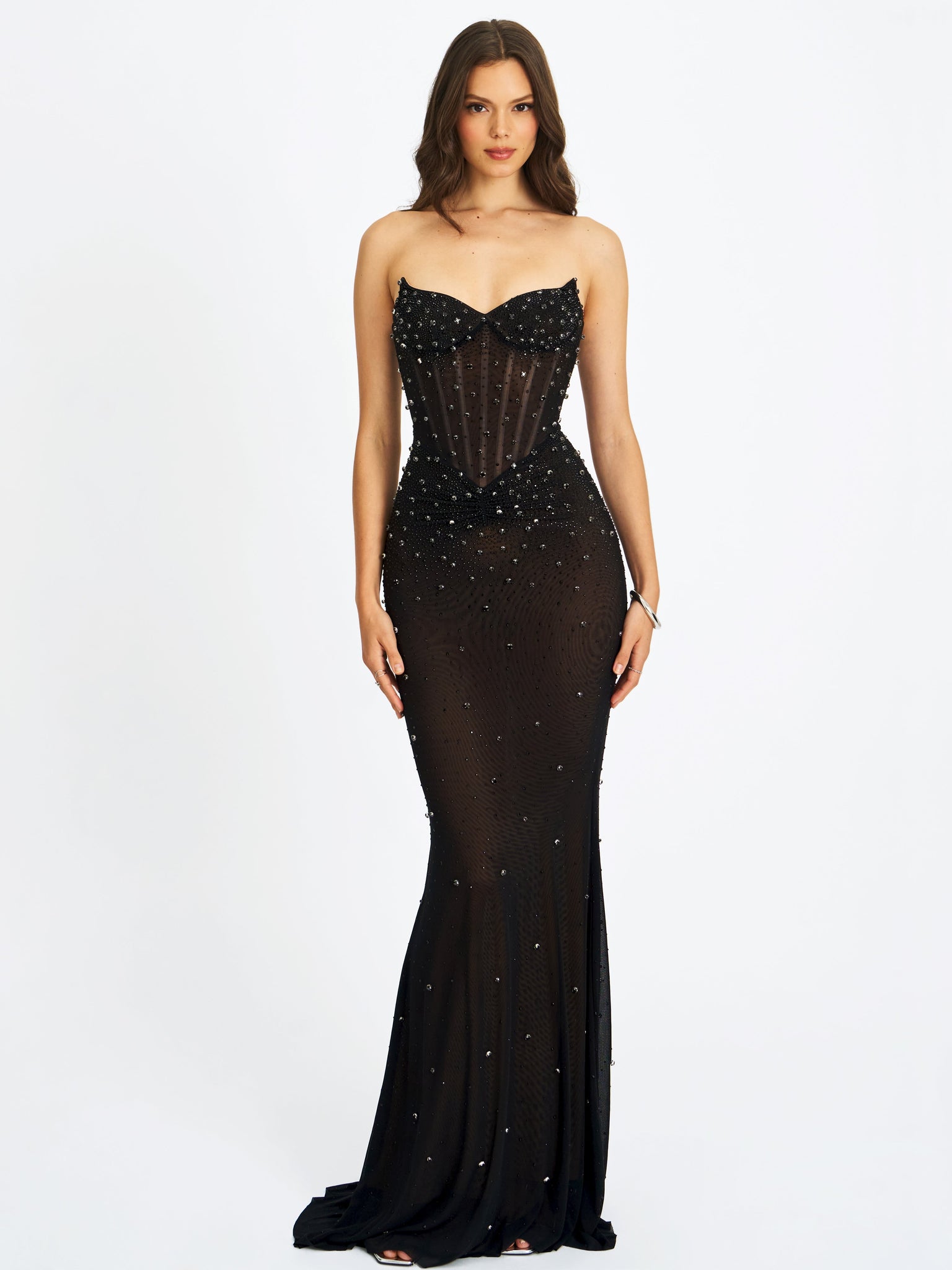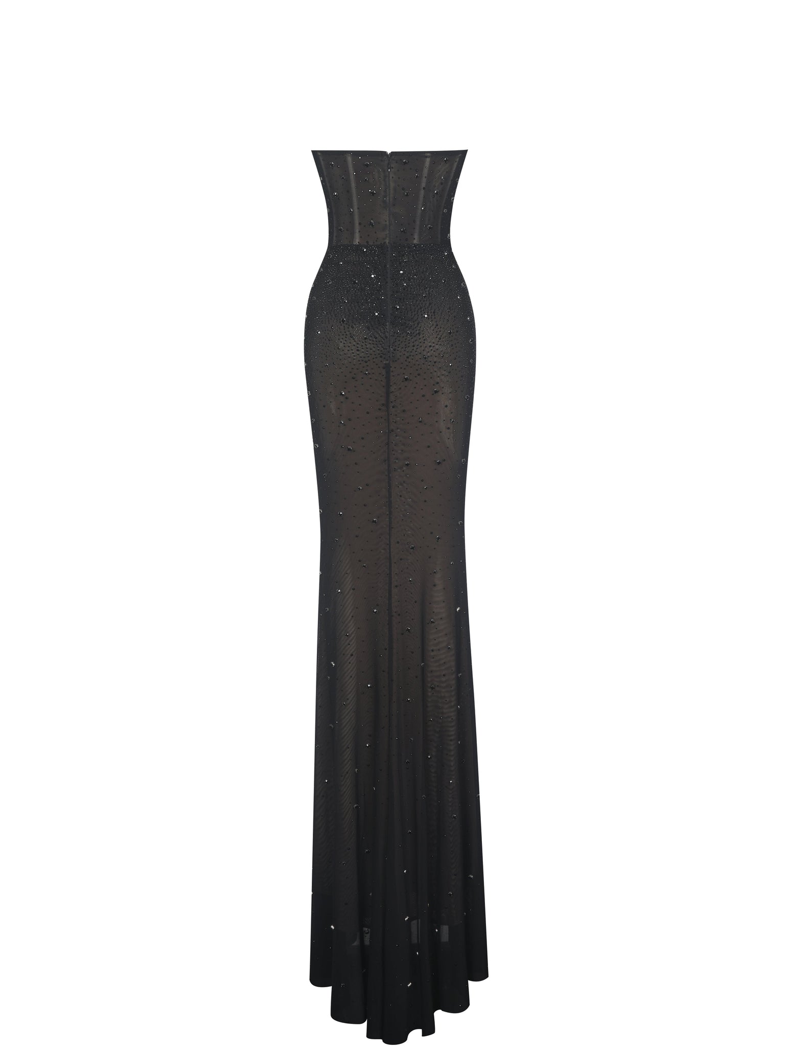 Introducing the Fatima dress, an exquisite mermaid maxi dress that embodies sophistication and glamour. Crafted from high-stretch mesh fabric and fully lined for comfort, this dress features built-in bones and padded cups, ensuring a flawless silhouette. The V-shape waistline accentuates your curves, while the crystal decorations add a touch of sparkle and elegance. Perfect for formal occasions, this dress combines luxurious details with a figure-enhancing design, making it a standout piece in any wardrobe. It is also available in Nude, Red, and Green.