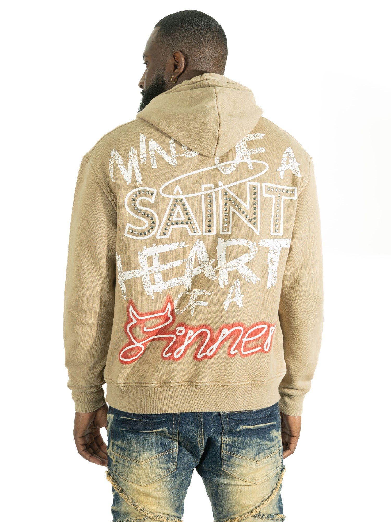 The back delivers a powerful message — “Mind of a Saint, Heart of a Sinner” — blending faith, struggle, and street culture into one unforgettable design. Built with heavyweight fleece and an oversized fit, this piece brings both comfort and presence to your everyday look.