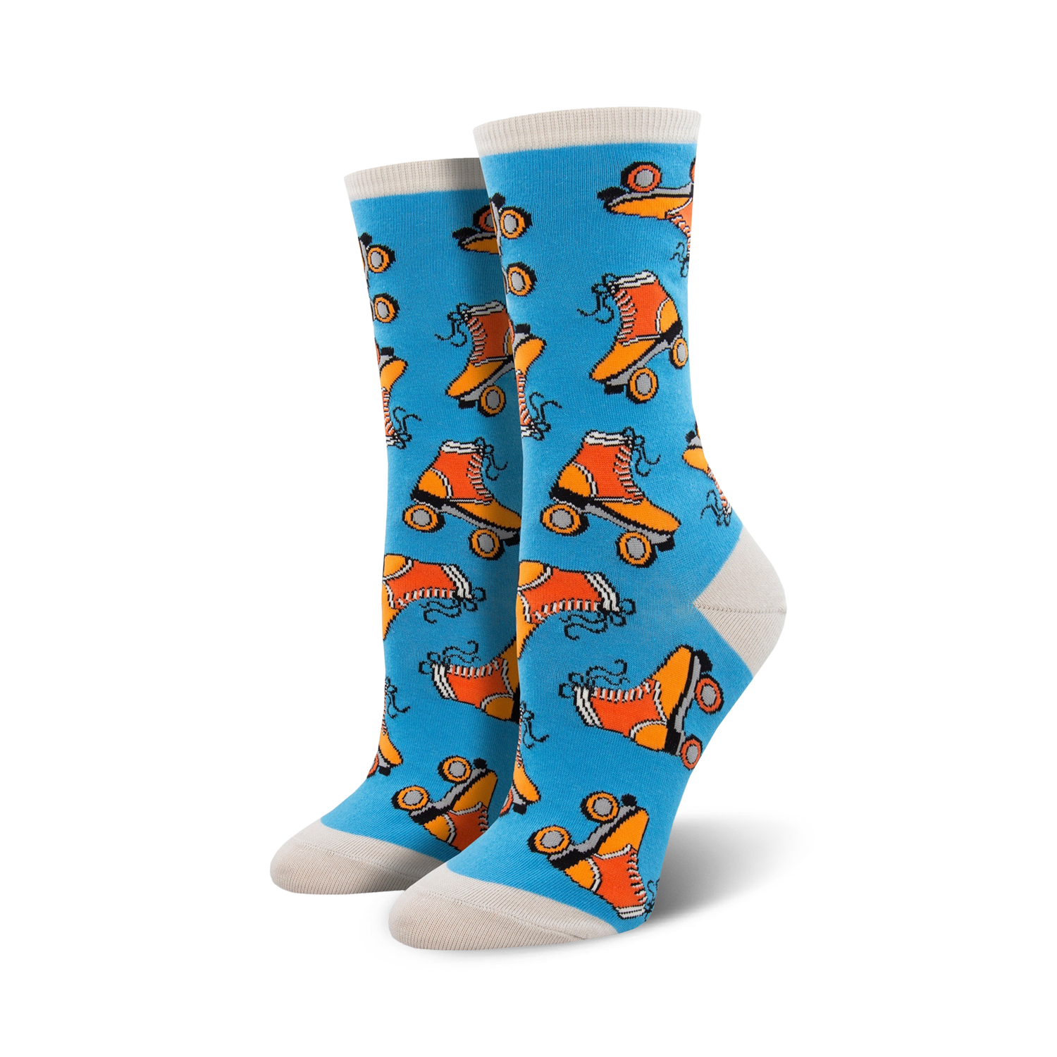 Introducing the Free Skate Crew socks for women: a roller-skating extravaganza for your feet! Feel the wind in your hair and the wheels beneath your feet with these socks, featuring a vibrant pattern of blue and yellow roller skates on a fire-engine red background. Whether you're cruising down the boardwalk or just rollin' through your day-to-day life, these socks will keep you feeling light on your feet and ready to boogie. Embrace the thrill of the skate with the Free Skate socks!